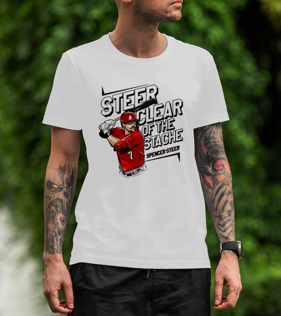 Spencer Steer Clear Of The Stache Baseball Player Illustration With Red Jersey And Bat T-Shirt