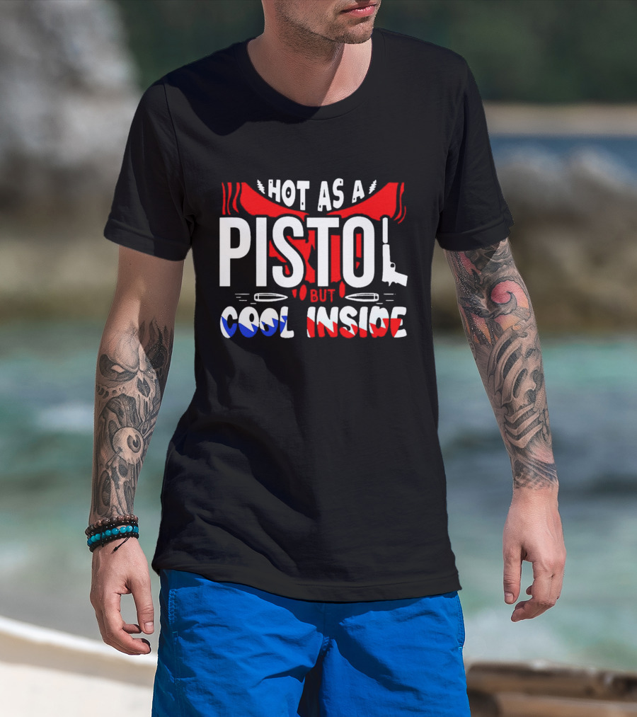 The Hot as a Pistol But Cool Inside Red White and Blue T-shirt is designed for everyday wear and a consistent fit. Fabric is pre-shrunk ring-spun cotton with durable stitching. See the size chart below for exact measurements.