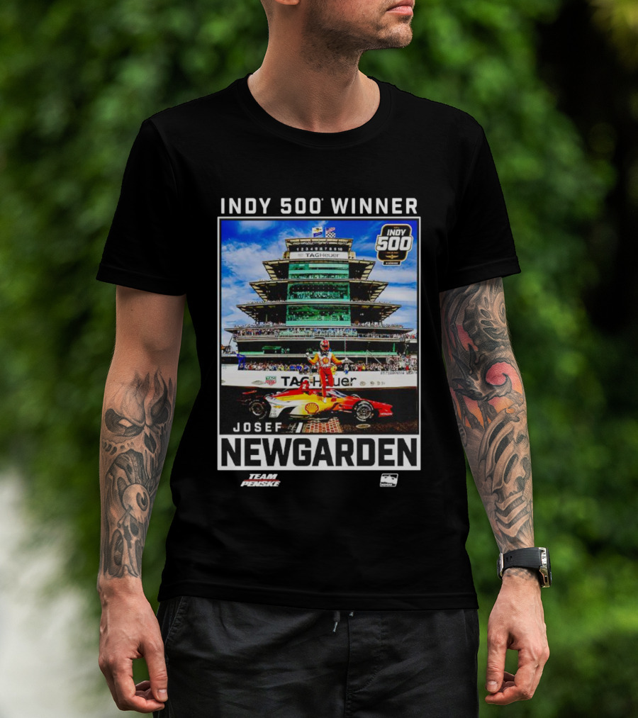 The Indy 500 Winner Josef Newgarden Team Penske TAG Heuer Race Car and Pagoda Background T-shirt is designed for everyday wear and a consistent fit. Fabric is pre-shrunk ring-spun cotton with durable stitching. See the size chart below for exact measurements.