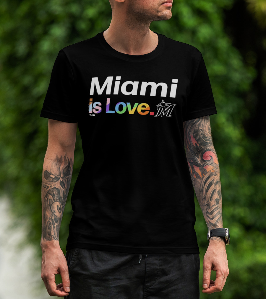 The Miami Marlins Is Love Pride T-shirt is designed for everyday wear and a consistent fit. Fabric is pre-shrunk ring-spun cotton with durable stitching. See the size chart below for exact measurements.