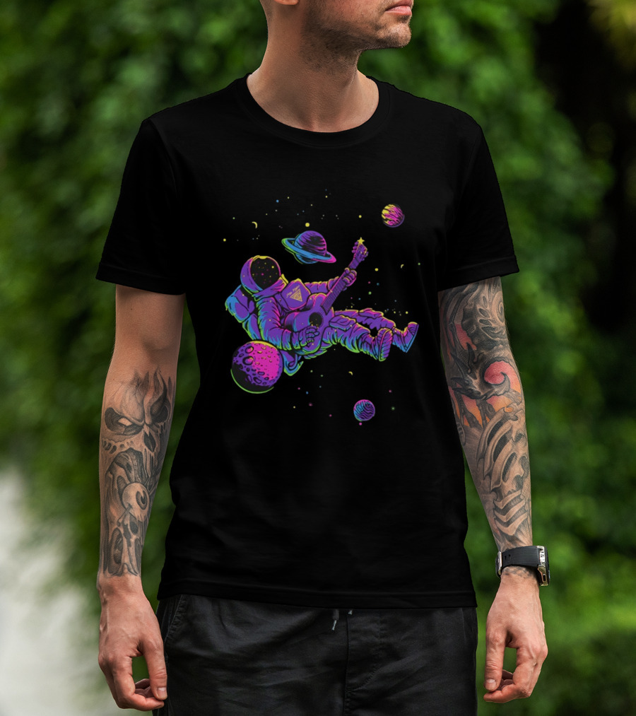 The Mile Higher Far Out Astronaut Playing Guitar in Space Among Planets T-shirt is designed for everyday wear and a consistent fit. Fabric is pre-shrunk ring-spun cotton with durable stitching. See the size chart below for exact measurements.