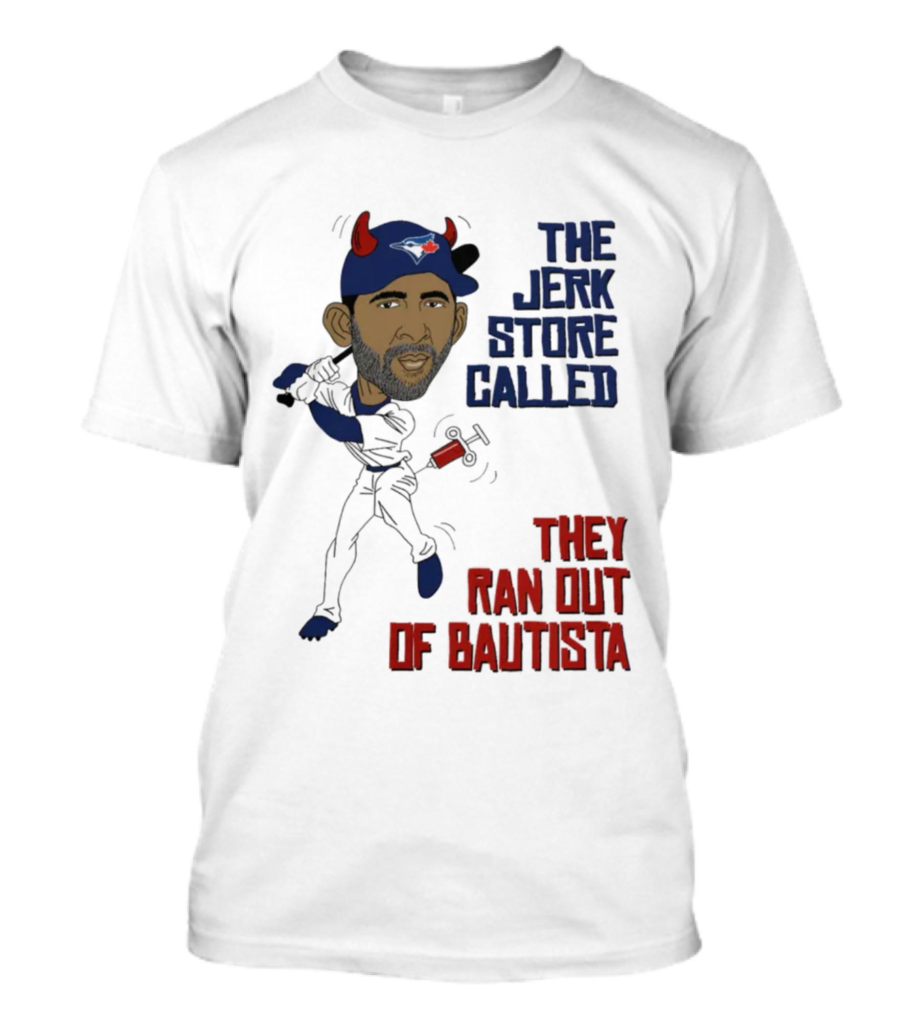 The Toronto The Jerk Store Called They Ran Out Of Bautista Baseball Cartoon T-shirt is designed for everyday wear and a consistent fit. Fabric is pre-shrunk ring-spun cotton with durable stitching. See the size chart below for exact measurements.