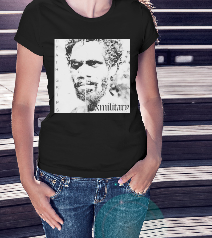 The DEATH GRIPS EXMILITARY ALBUM COVER IMAGE WHITE LETTERS AND PORTRAIT T-shirt is designed for everyday wear and a consistent fit. Fabric is pre-shrunk ring-spun cotton with durable stitching. See the size chart below for exact measurements.