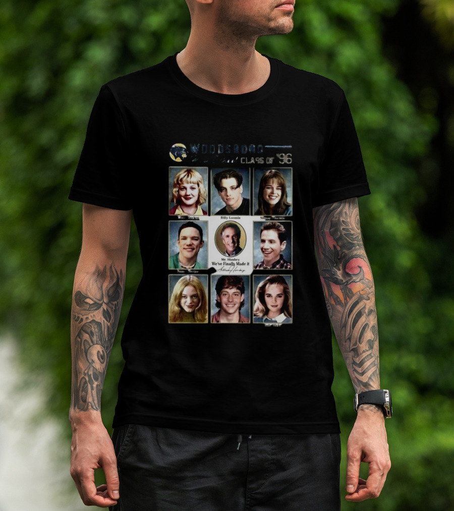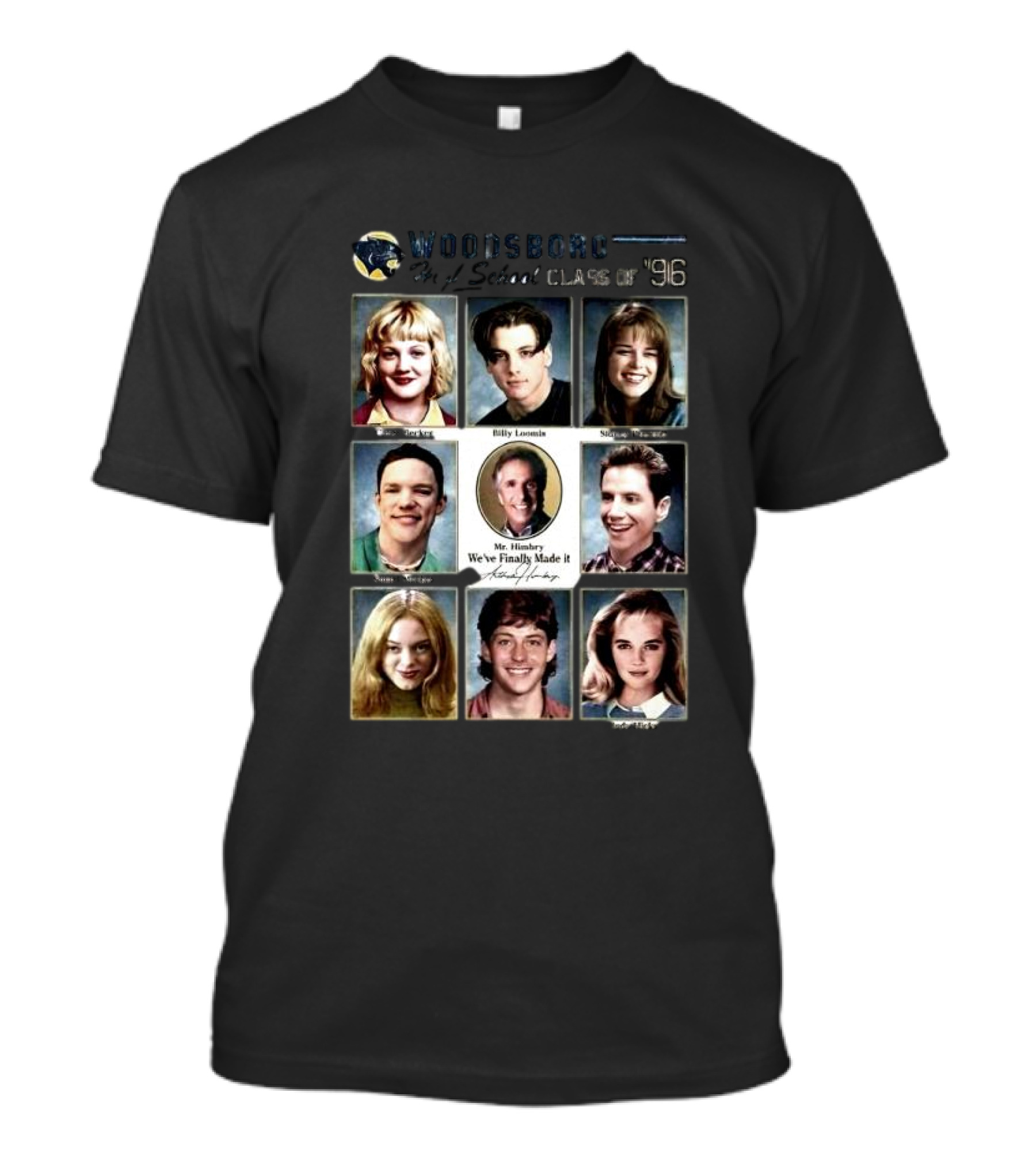 The Woodsboro High School Class of '96 Yearbook Featuring Tatum Stu Billy Sidney Mr. Himbry T-shirt is designed for everyday wear and a consistent fit. Fabric is pre-shrunk ring-spun cotton with durable stitching. See the size chart below for exact measurements.