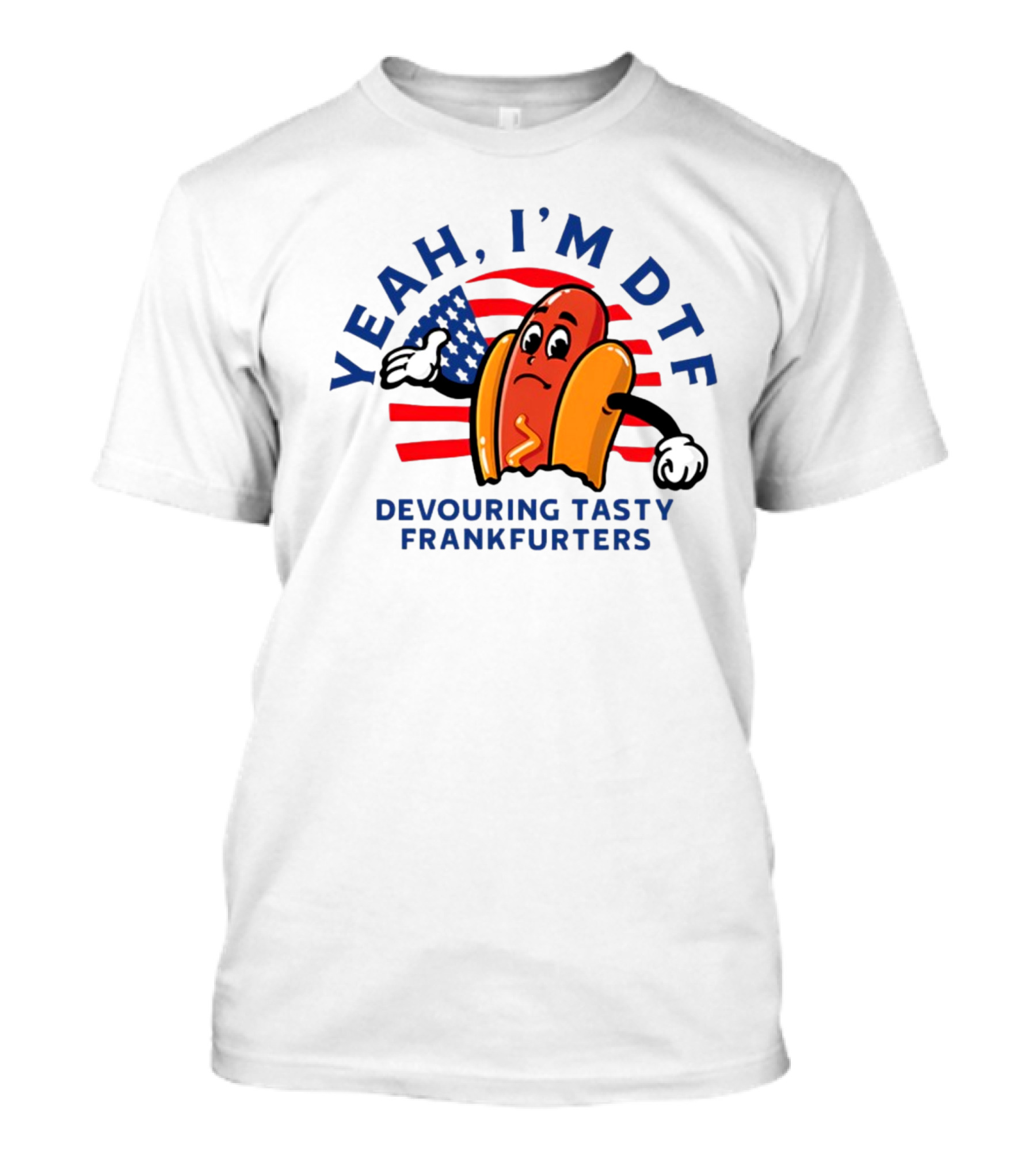 The Yeah I'm DTF Devouring Tasty Frankfurters Shitheadsteve Hot Dog Cartoon with American Flag Background T-shirt is designed for everyday wear and a consistent fit. Fabric is pre-shrunk ring-spun cotton with durable stitching. See the size chart below for exact measurements.