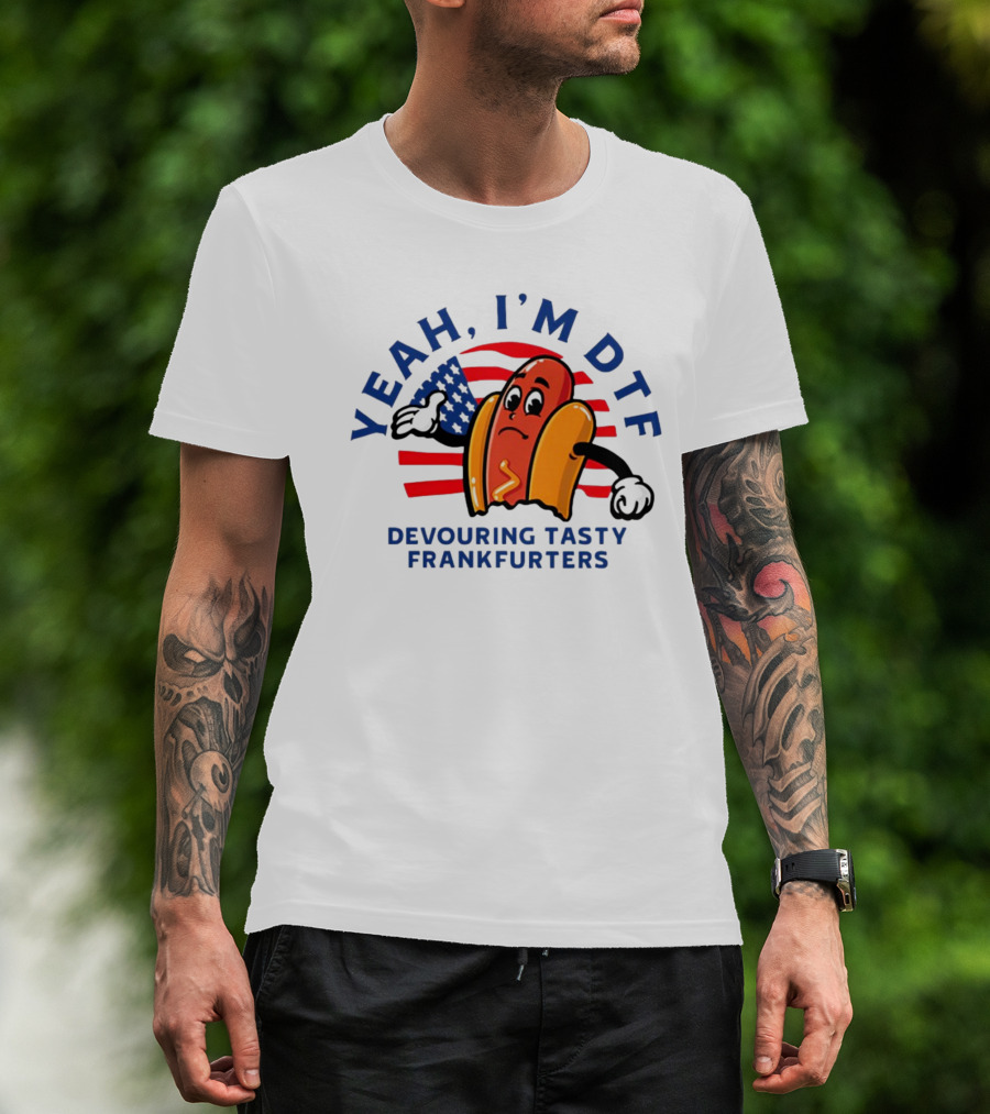 Yeah I'm DTF Devouring Tasty Frankfurters Shitheadsteve Hot Dog Cartoon With American Flag Background T-Shirt