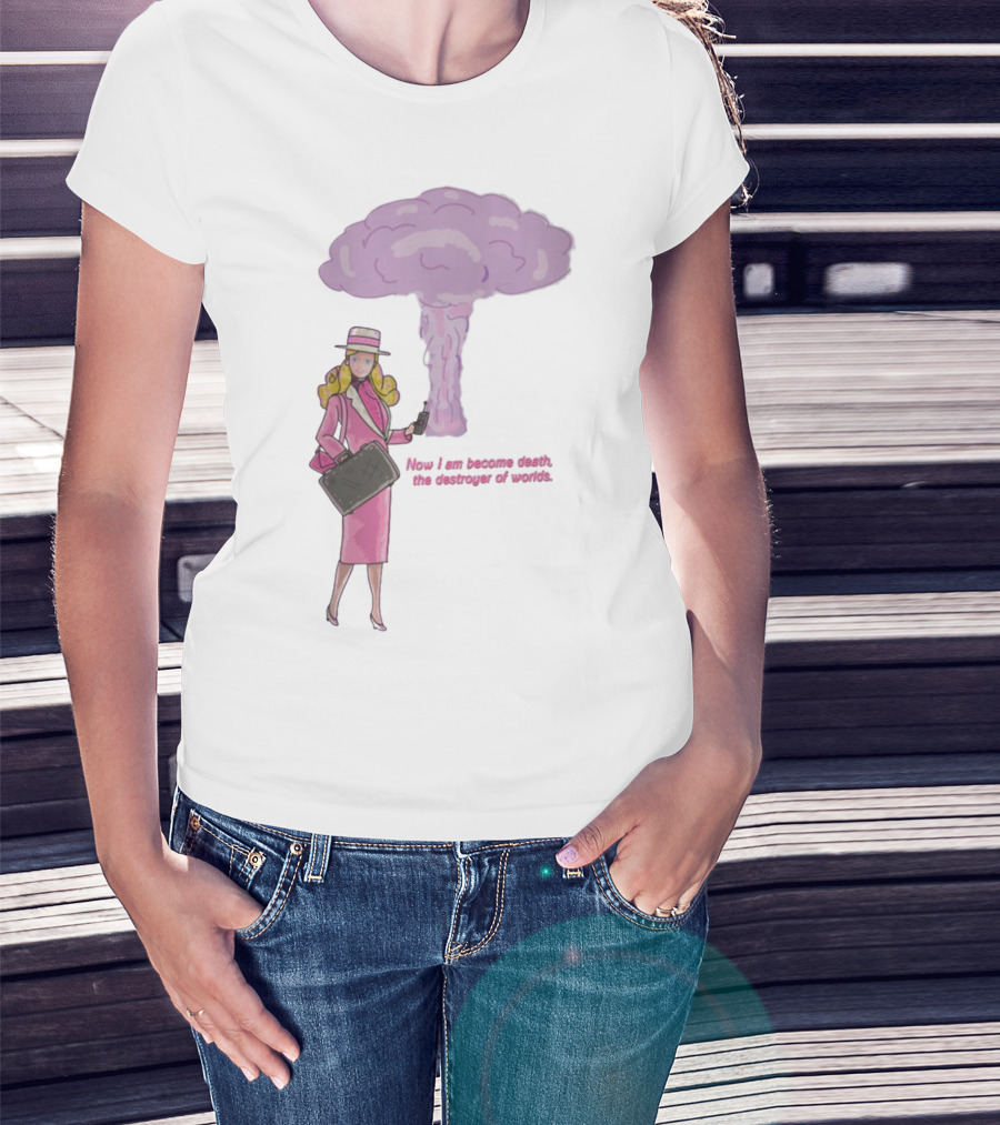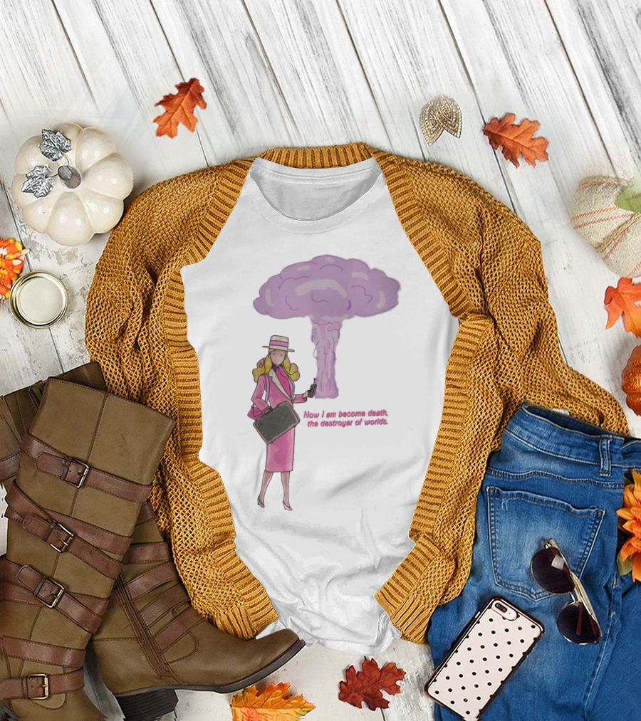 Now I Am Become Death The Destroyer Of Worlds Blonde Woman Pink Outfit Holding Bag Phone With Purple Mushroom Cloud T-Shirt