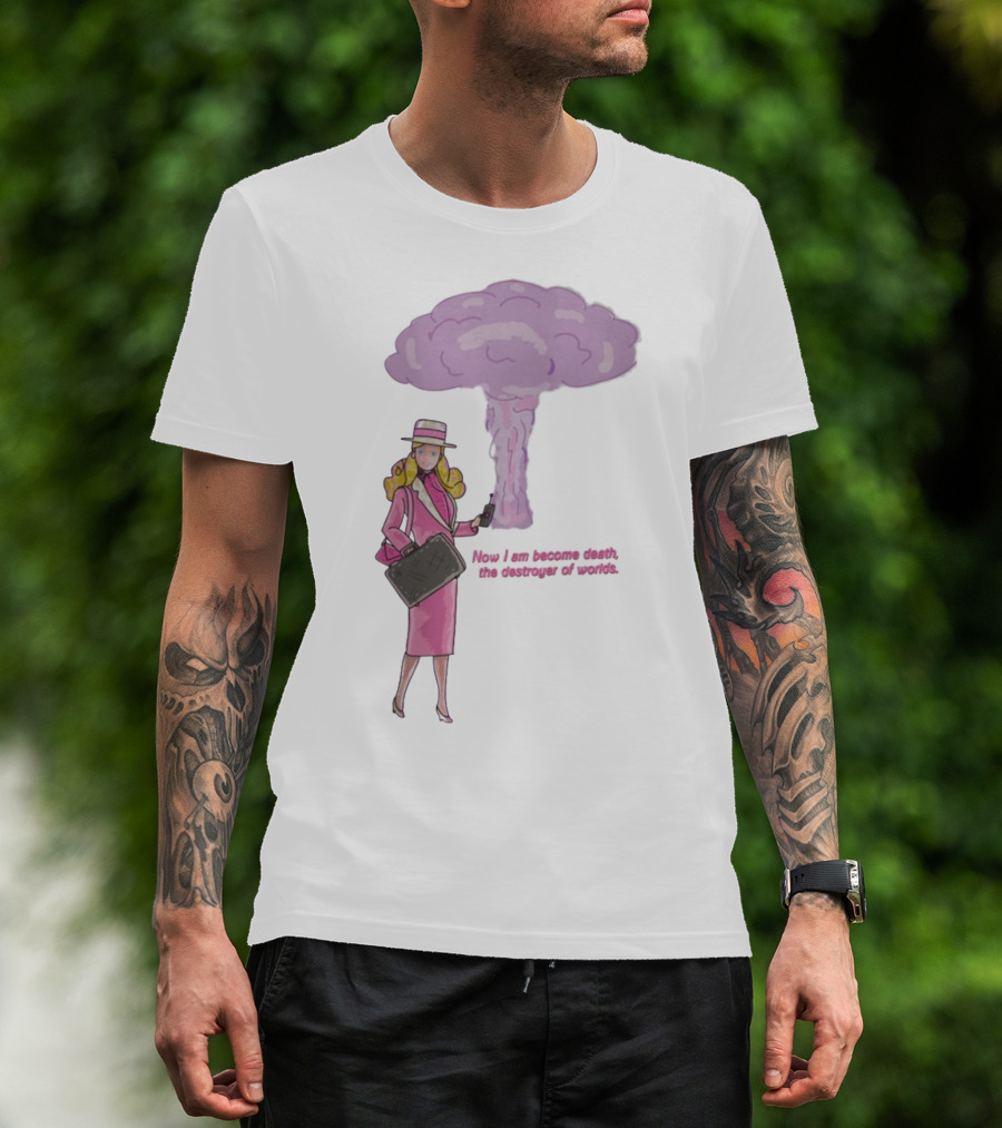 The Now I Am Become Death The Destroyer Of Worlds Blonde Woman Pink Outfit Holding Bag Phone With Purple Mushroom Cloud T-shirt is designed for everyday wear and a consistent fit. Fabric is pre-shrunk ring-spun cotton with durable stitching. See the size chart below for exact measurements.