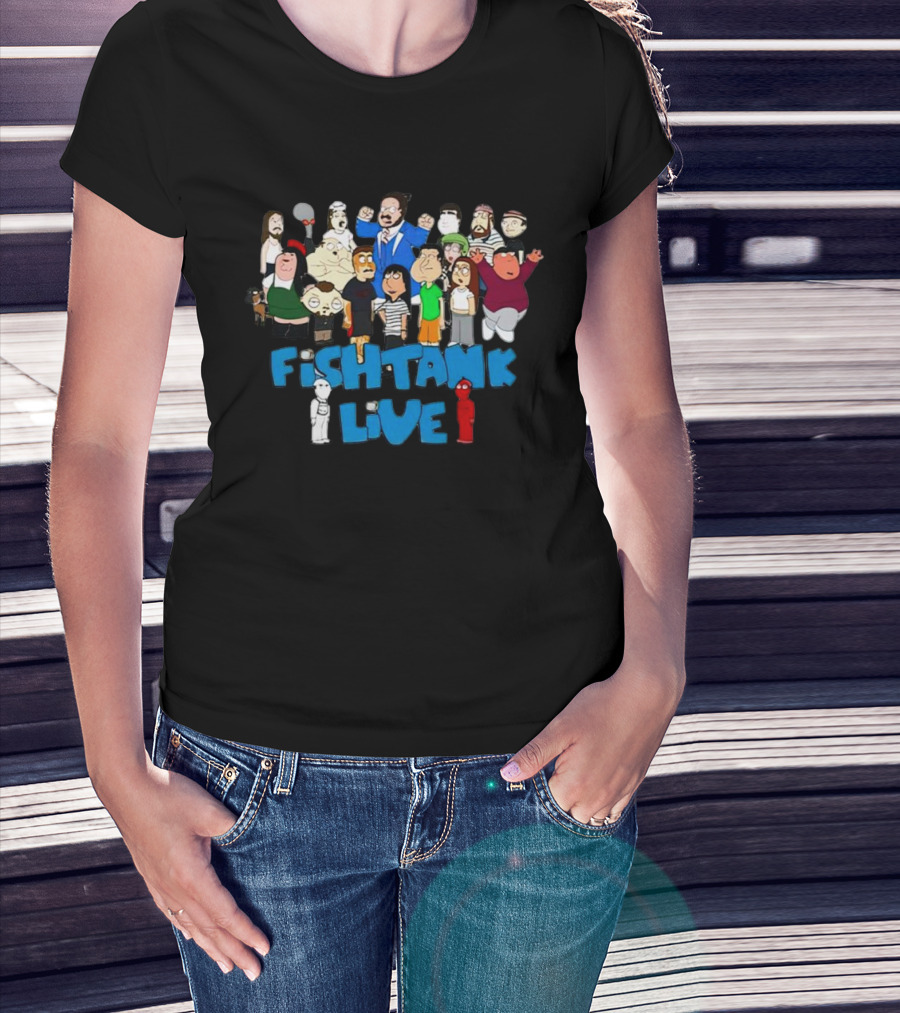 The Fish Tank Live Cartoon Character Group T-shirt is designed for everyday wear and a consistent fit. Fabric is pre-shrunk ring-spun cotton with durable stitching. See the size chart below for exact measurements.
