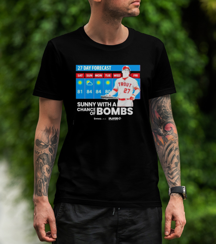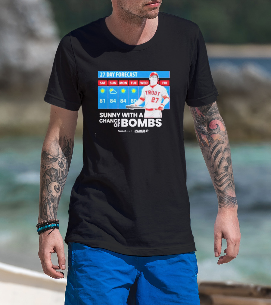 The Trout 27 Day Forecast Sunny with a Chance of Bombs Players Swing T-shirt is designed for everyday wear and a consistent fit. Fabric is pre-shrunk ring-spun cotton with durable stitching. See the size chart below for exact measurements.
