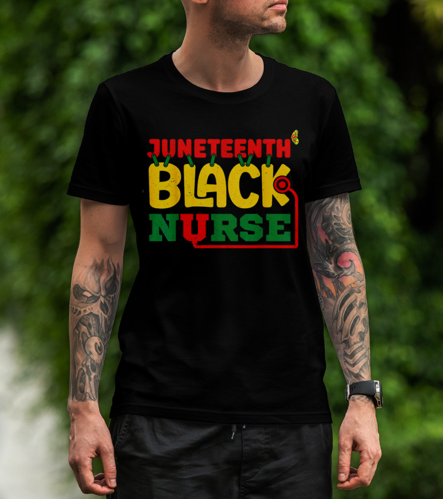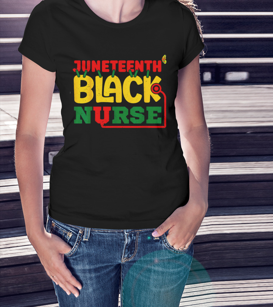 Juneteenth Black Nurse Red Yellow Green Butterfly Stethoscope T-Shirt