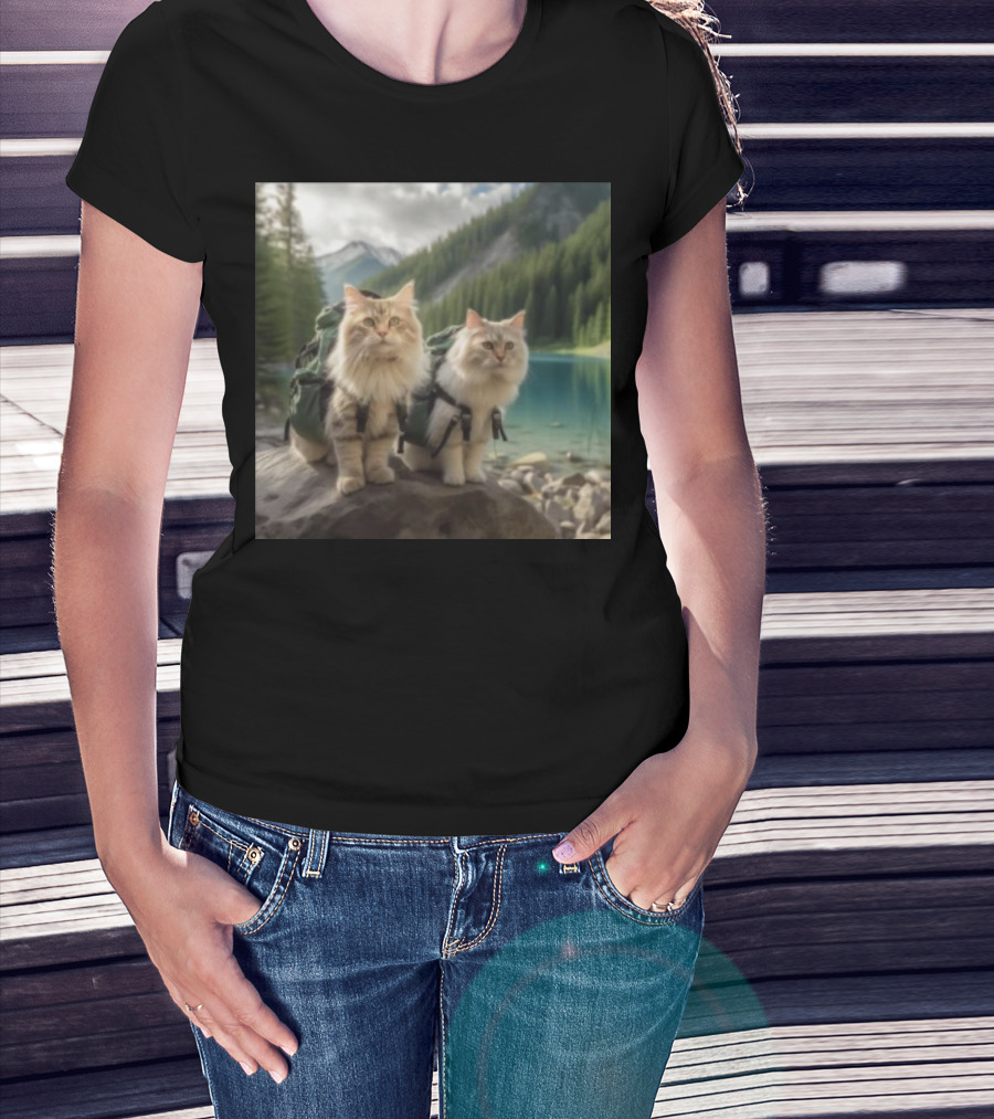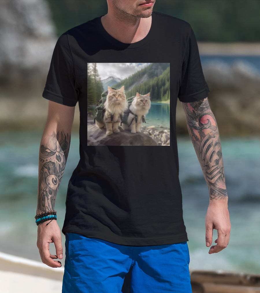 Two American Longhair Cats Are Mountaineering With Backpacks In Scenic Mountain Forest Near Lake T-Shirt