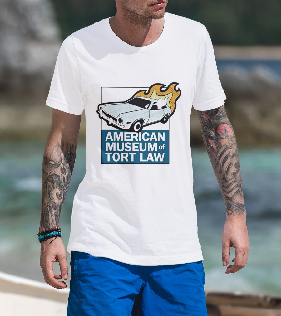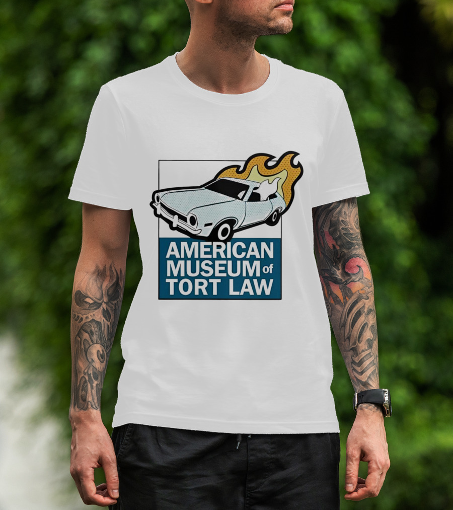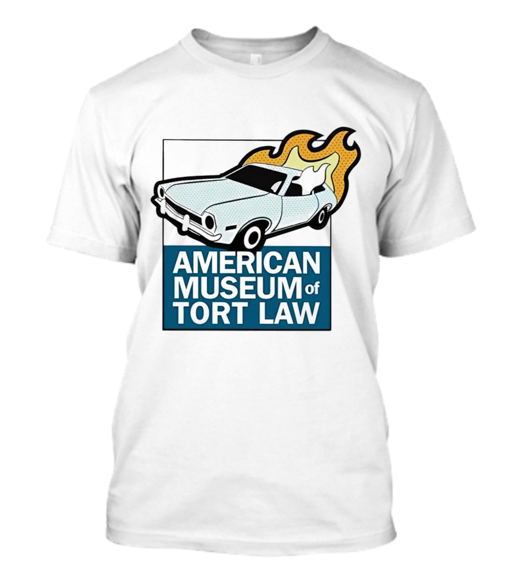 The American Museum of Tort Law Flaming Car T-shirt is designed for everyday wear and a consistent fit. Fabric is pre-shrunk ring-spun cotton with durable stitching. See the size chart below for exact measurements.