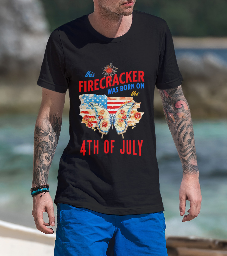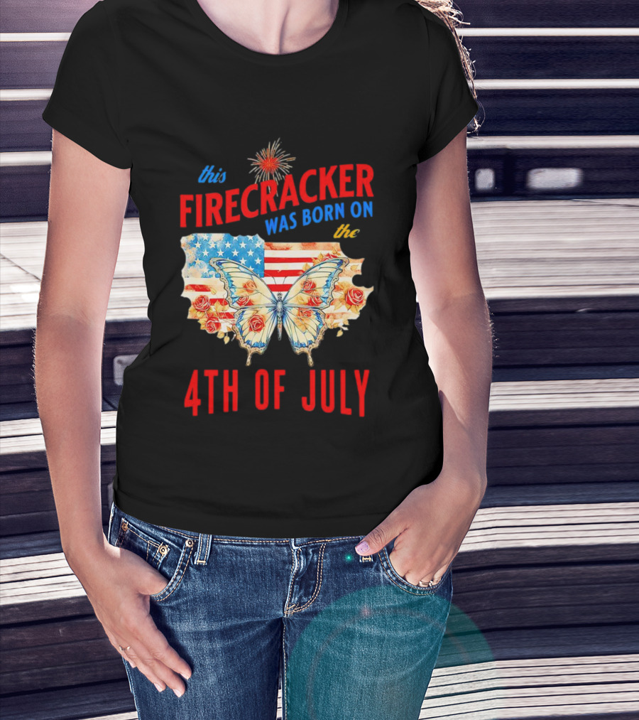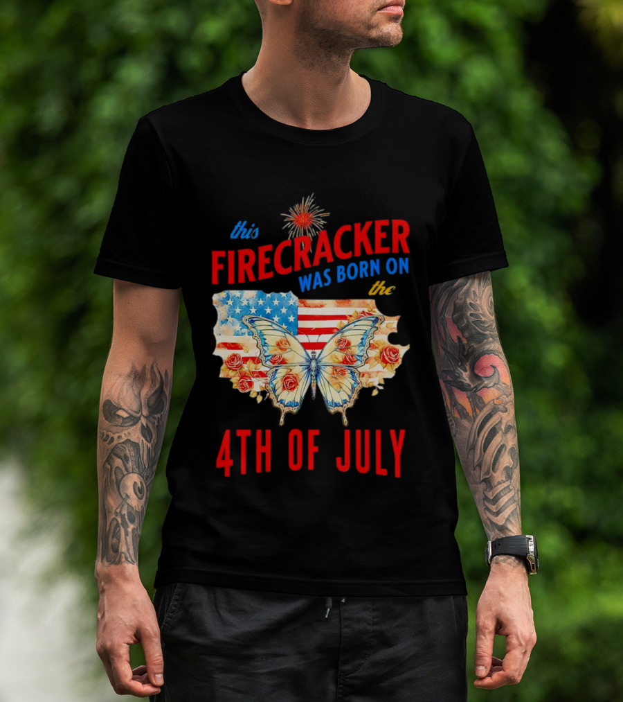 This Firecracker Was Born On The Fourth Of July With American Flag Butterfly And Roses T-Shirt