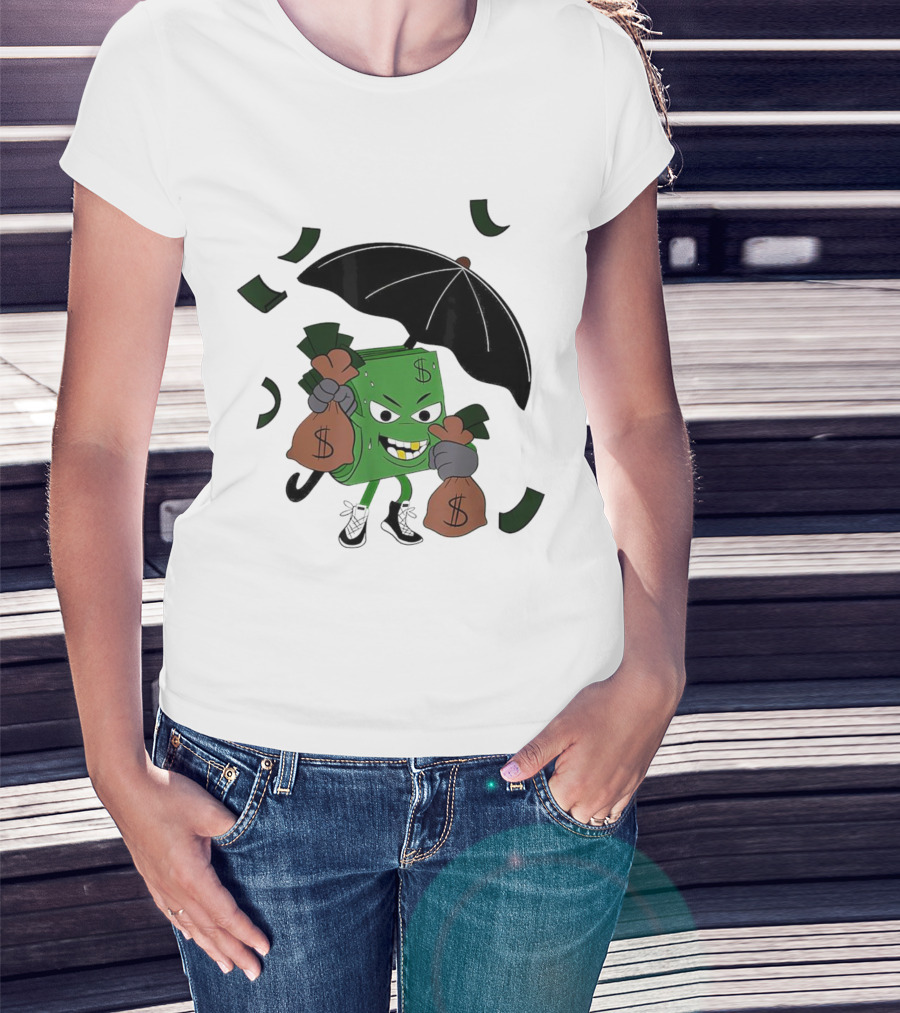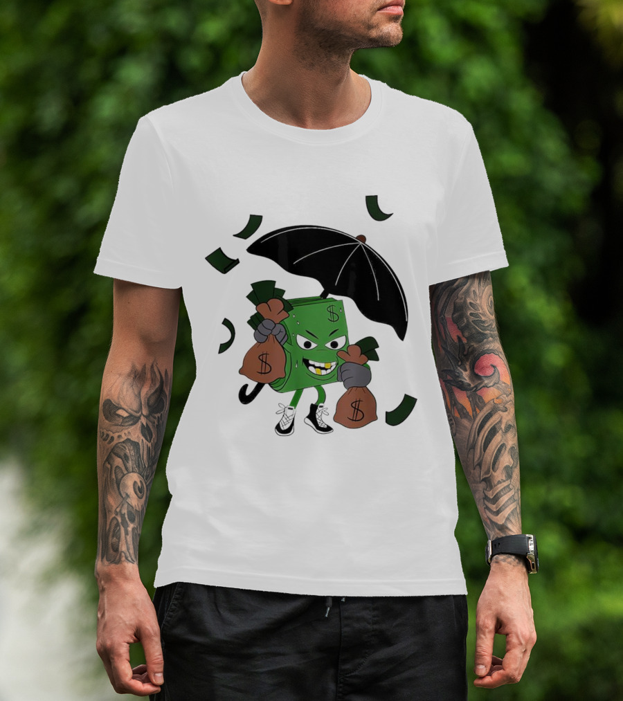 The Money Man Holding Money Bags and Umbrella T-shirt is designed for everyday wear and a consistent fit. Fabric is pre-shrunk ring-spun cotton with durable stitching. See the size chart below for exact measurements.