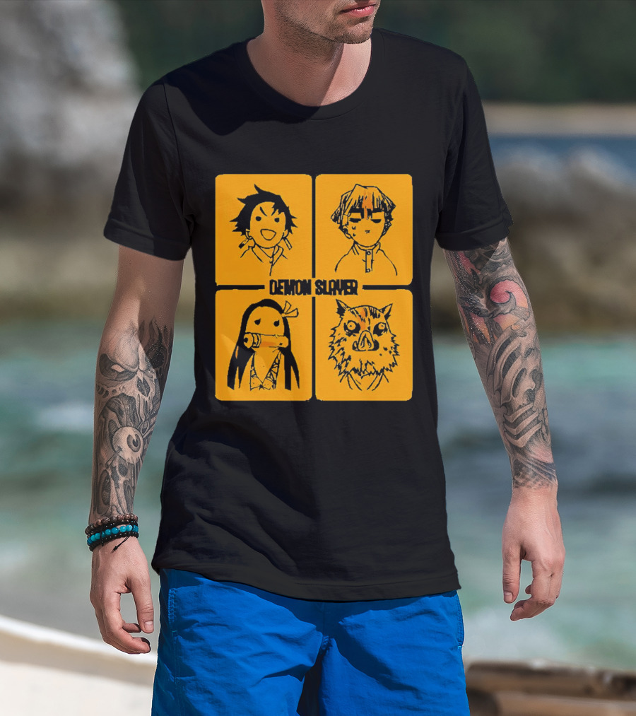 The Demon Slayer Tanjiro Nezuko Inosuke Zenitsu Iconic Characters T-shirt is designed for everyday wear and a consistent fit. Fabric is pre-shrunk ring-spun cotton with durable stitching. See the size chart below for exact measurements.
