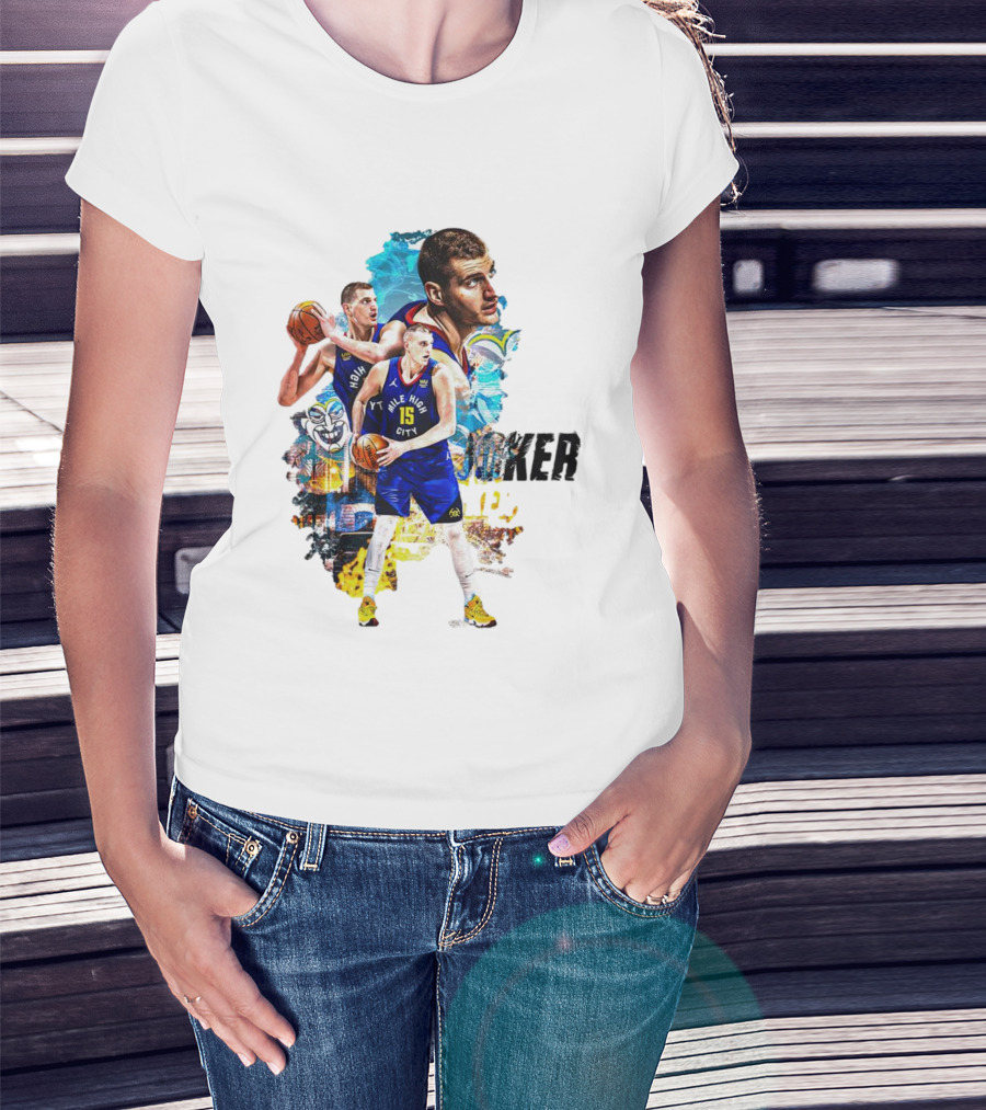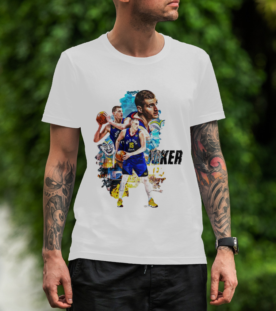 The Nikola Jokic Joker Denver Basketball Player Dynamic Collage T-shirt is designed for everyday wear and a consistent fit. Fabric is pre-shrunk ring-spun cotton with durable stitching. See the size chart below for exact measurements.