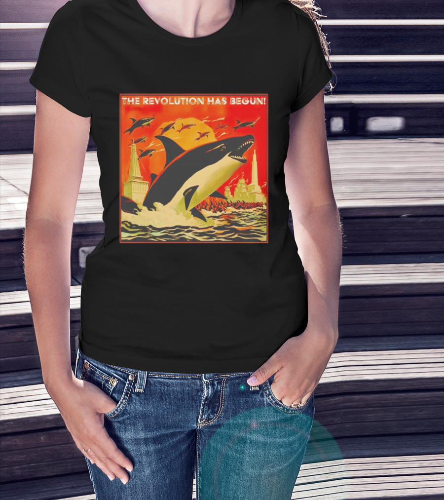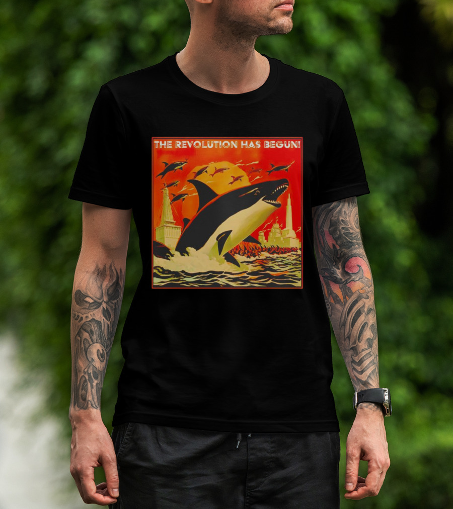 The Revolution Has Begun Orca Tower Attack With Jumping Killer Whales And Red Sky T-Shirt