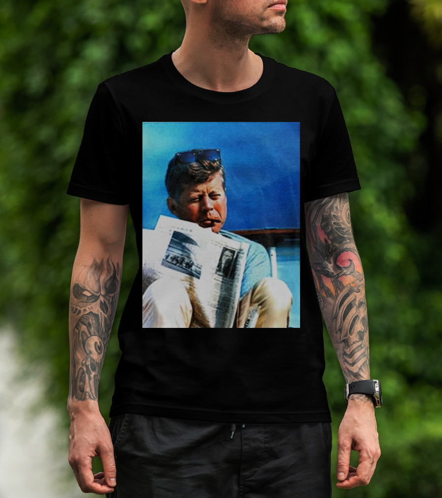 The JFK Reading Newspaper on Summer Day T-shirt is designed for everyday wear and a consistent fit. Fabric is pre-shrunk ring-spun cotton with durable stitching. See the size chart below for exact measurements.