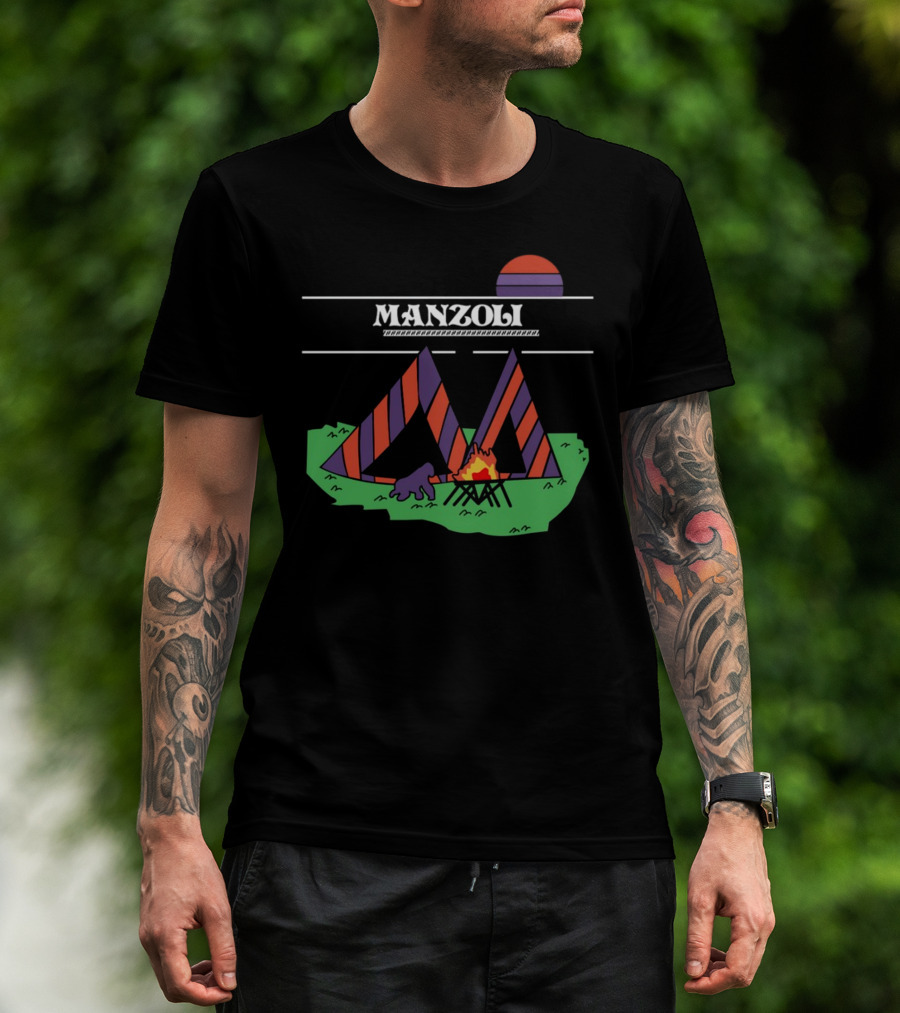 The MANZOLI Tent Camping Fire Sunset Stripes T-shirt is designed for everyday wear and a consistent fit. Fabric is pre-shrunk ring-spun cotton with durable stitching. See the size chart below for exact measurements.