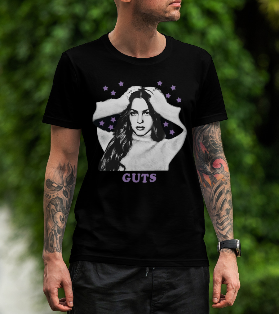 The Guts Olivia Rodrigo New Stars T-shirt is designed for everyday wear and a consistent fit. Fabric is pre-shrunk ring-spun cotton with durable stitching. See the size chart below for exact measurements.