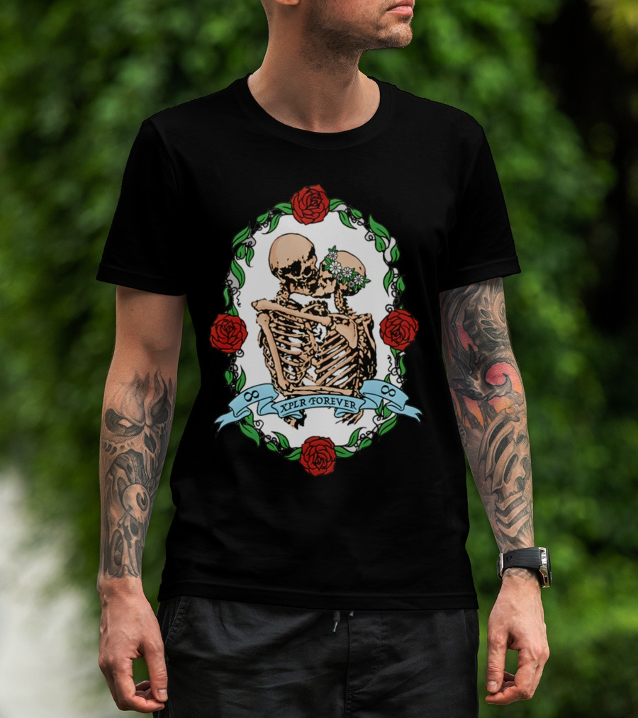 Xplr Forever Skeletons Embrace With Roses And Floral Wreath T-Shirt