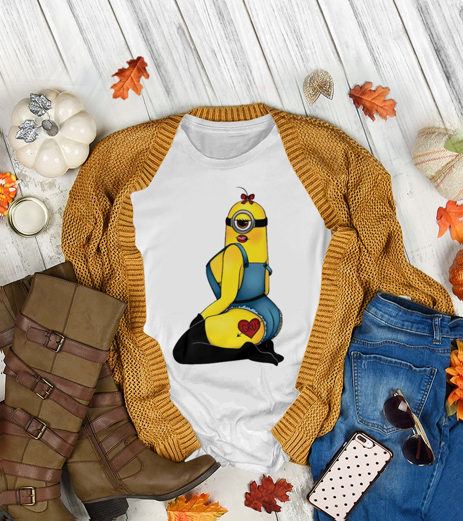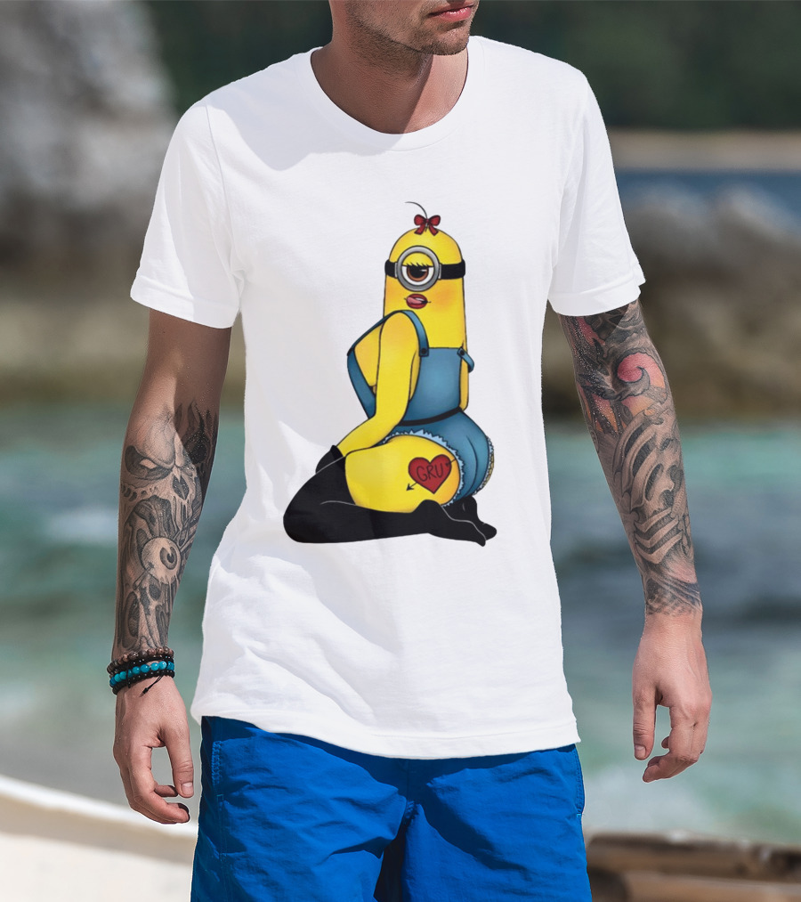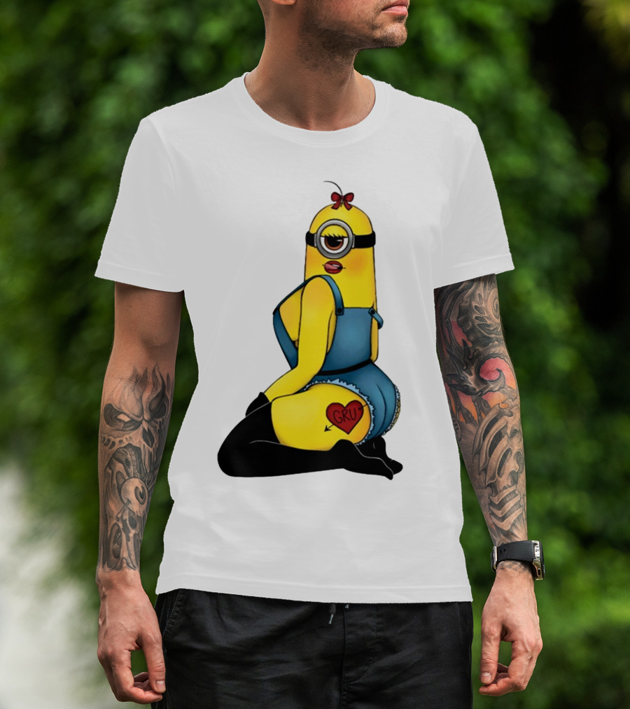 Minion In Blue Overalls With Gru Heart Tattoo And Red Bow T-Shirt
