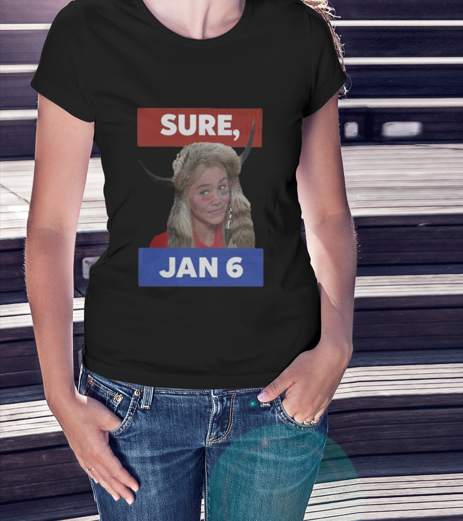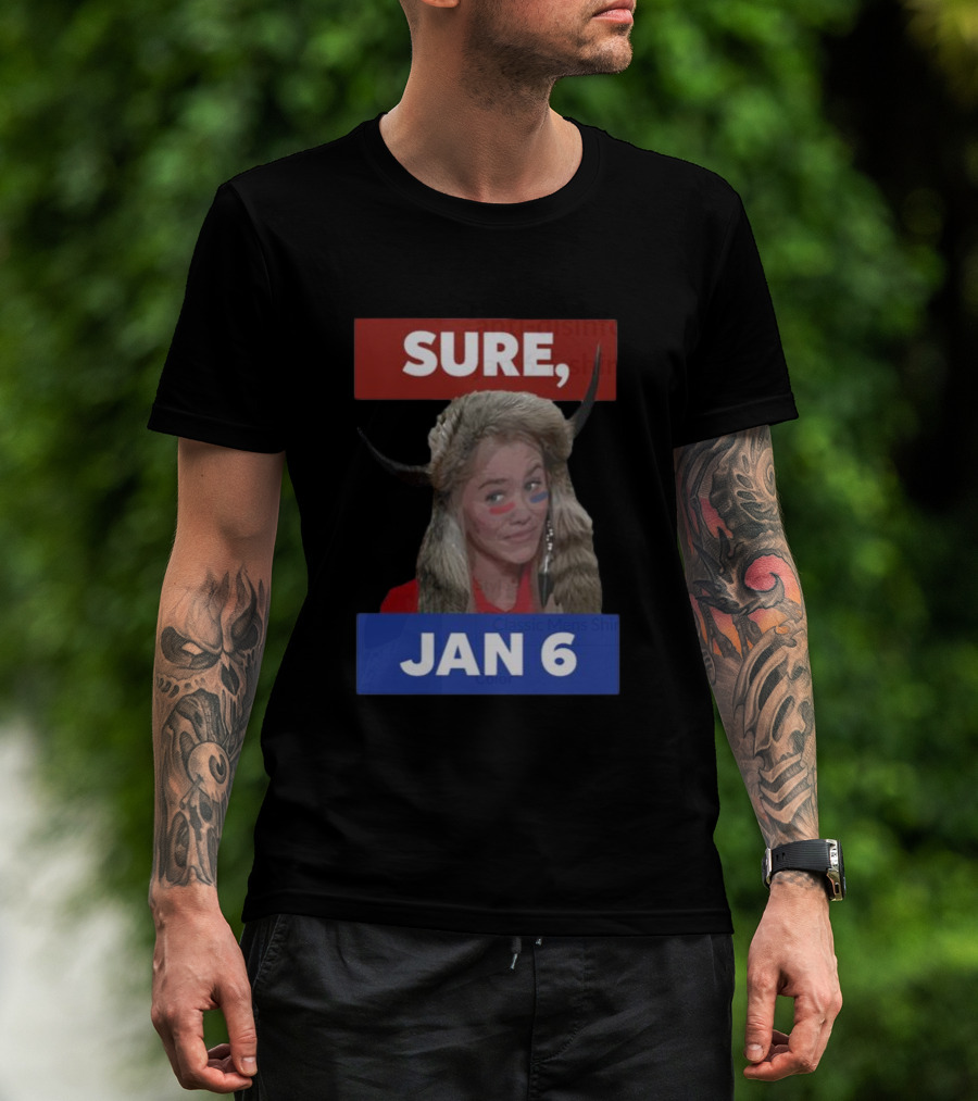 How much will this Jim Stewartson Anti-Disinfo Activist Sure Jan 6 Horned Headdress Red Blue Face Paint shirt shrink?