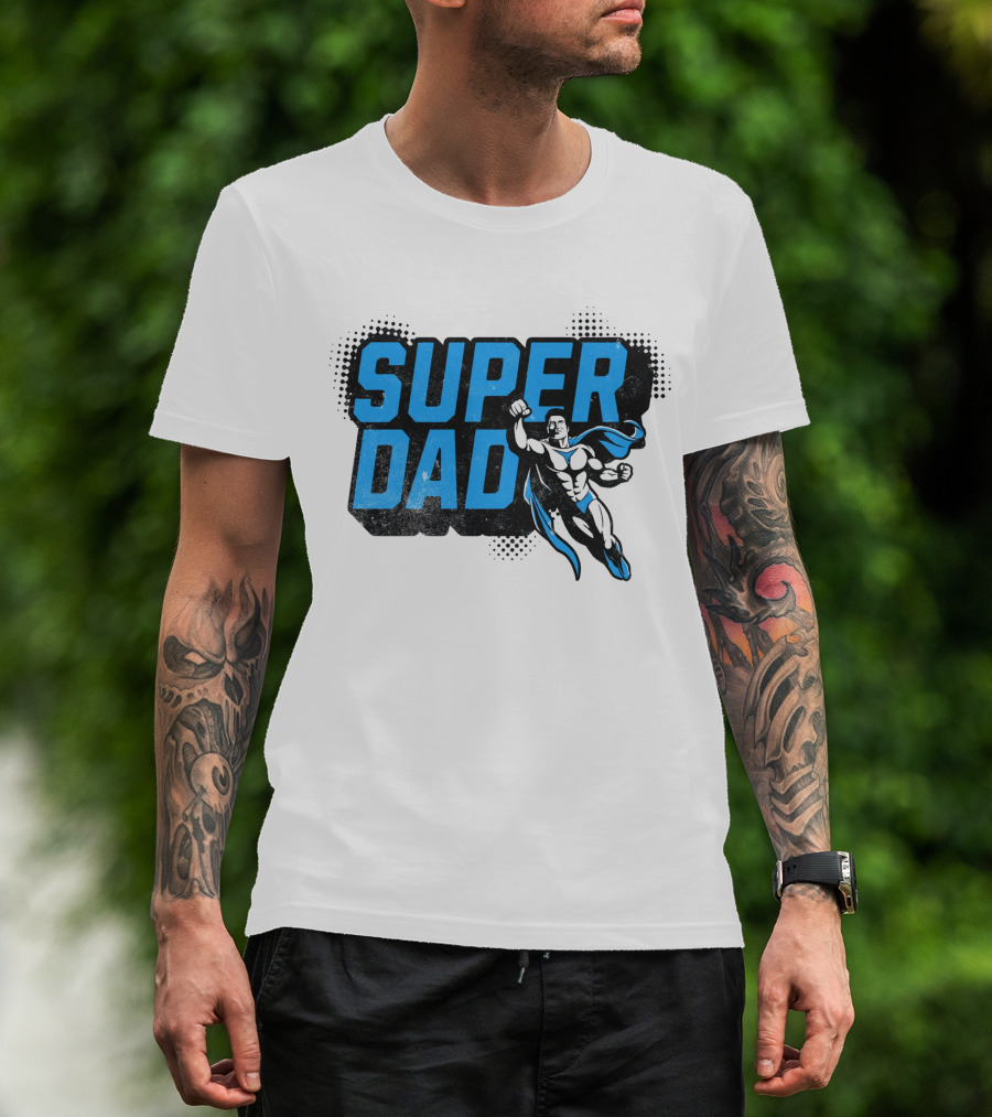 The SUPER DAD Hero Action Pose T-shirt is designed for everyday wear and a consistent fit. Fabric is pre-shrunk ring-spun cotton with durable stitching. See the size chart below for exact measurements.