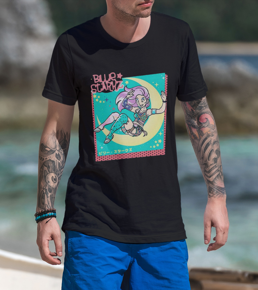 The Billie Starkz All Elite Wrestling Moon Jump T-shirt is designed for everyday wear and a consistent fit. Fabric is pre-shrunk ring-spun cotton with durable stitching. See the size chart below for exact measurements.