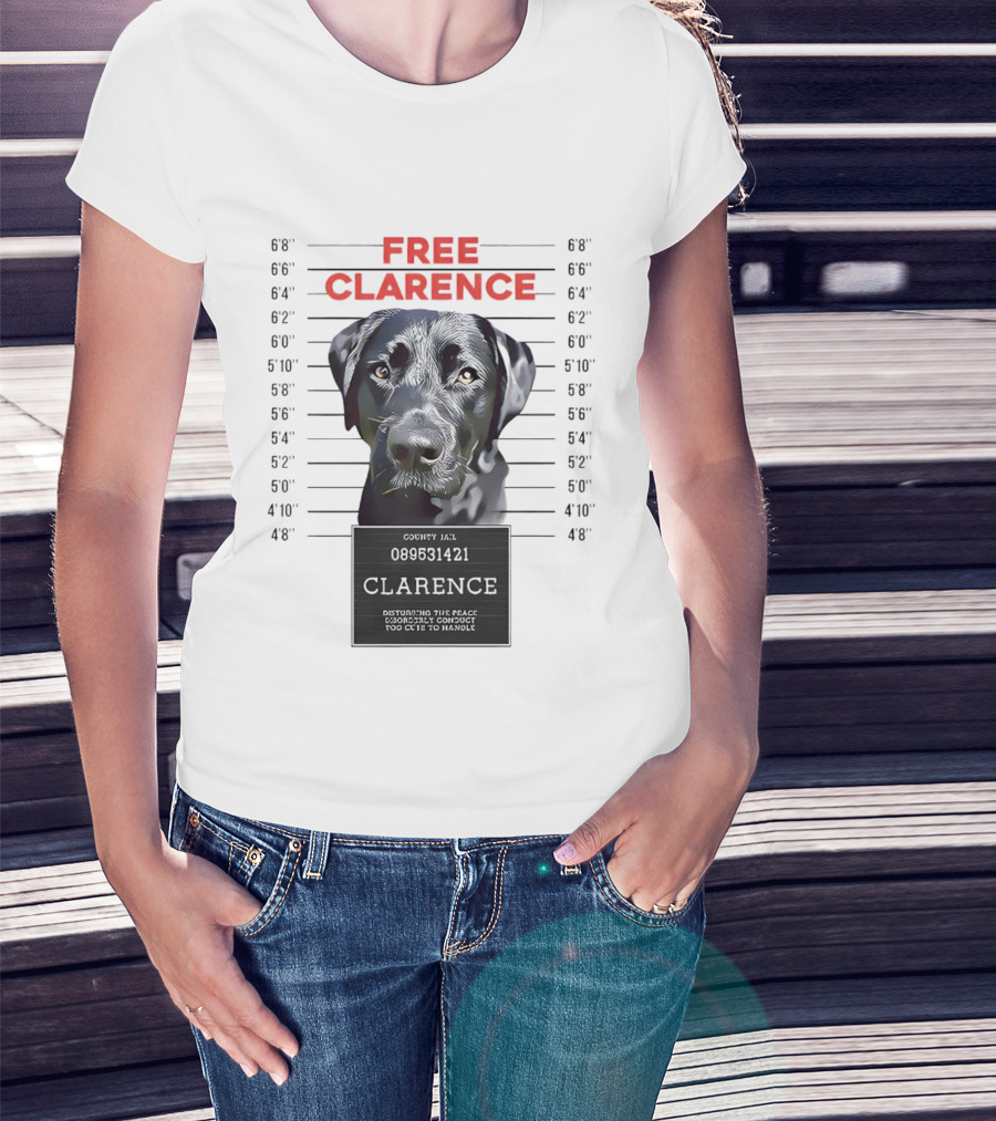 The Free Clarence Mugshot Dog T-shirt is designed for everyday wear and a consistent fit. Fabric is pre-shrunk ring-spun cotton with durable stitching. See the size chart below for exact measurements.