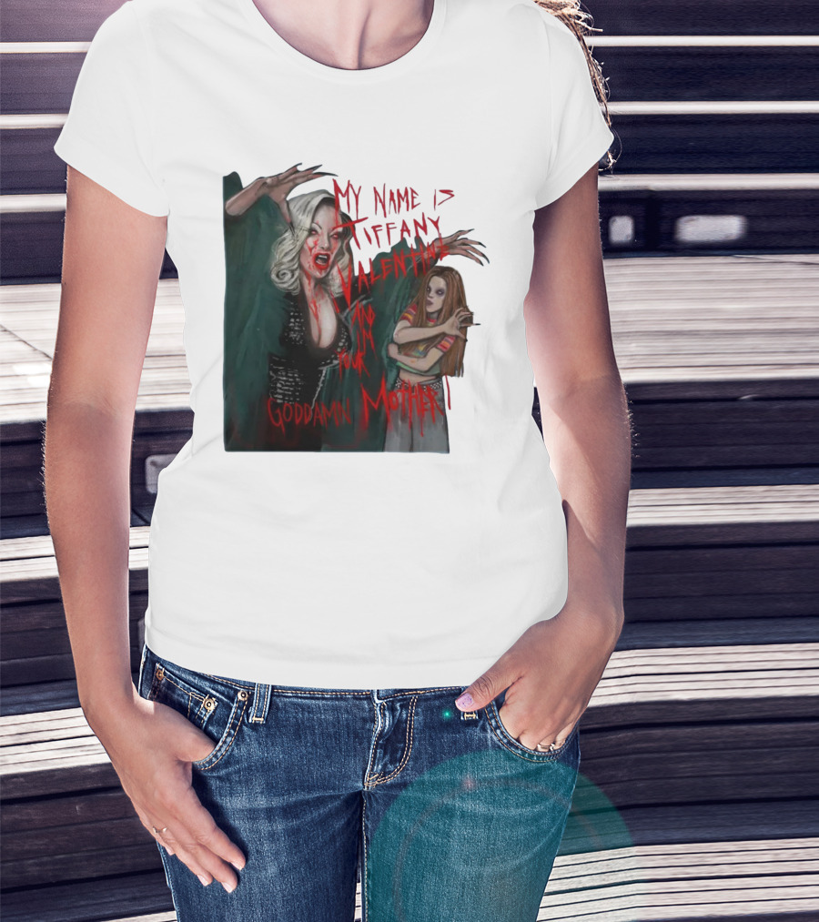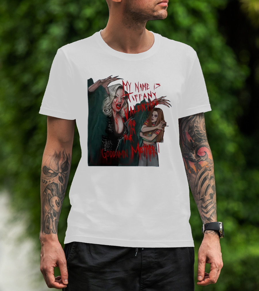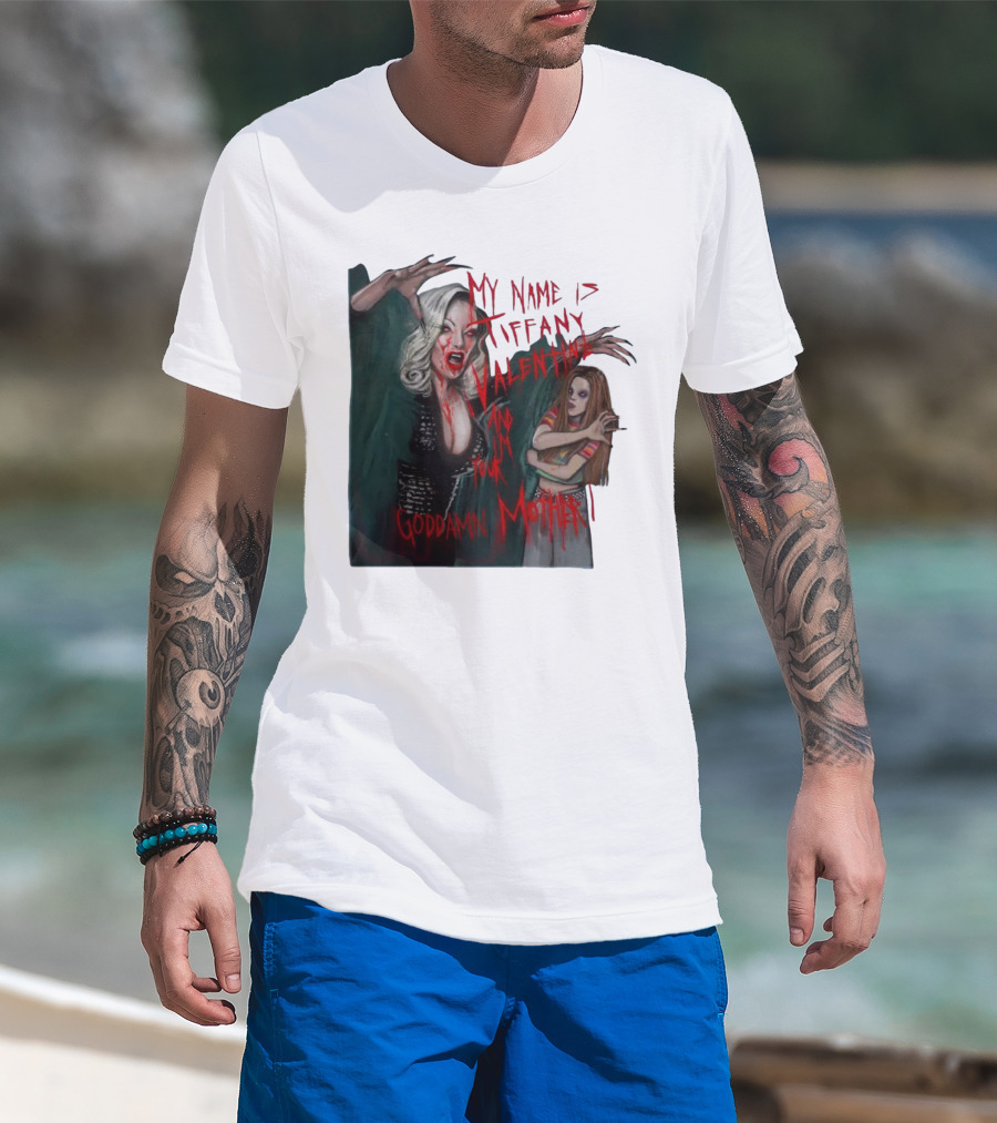 The Jennifer Tilly as Tiffany Valentine My Name Is Tiffany Valentine And I'm Your Goddamn Mother T-shirt is designed for everyday wear and a consistent fit. Fabric is pre-shrunk ring-spun cotton with durable stitching. See the size chart below for exact measurements.