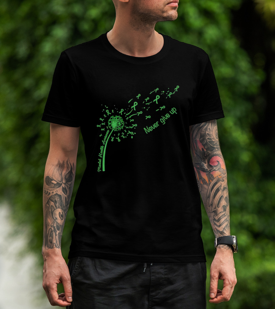 Mental Health Awareness Dandelion Green Ribbon Never Give Up T-Shirt