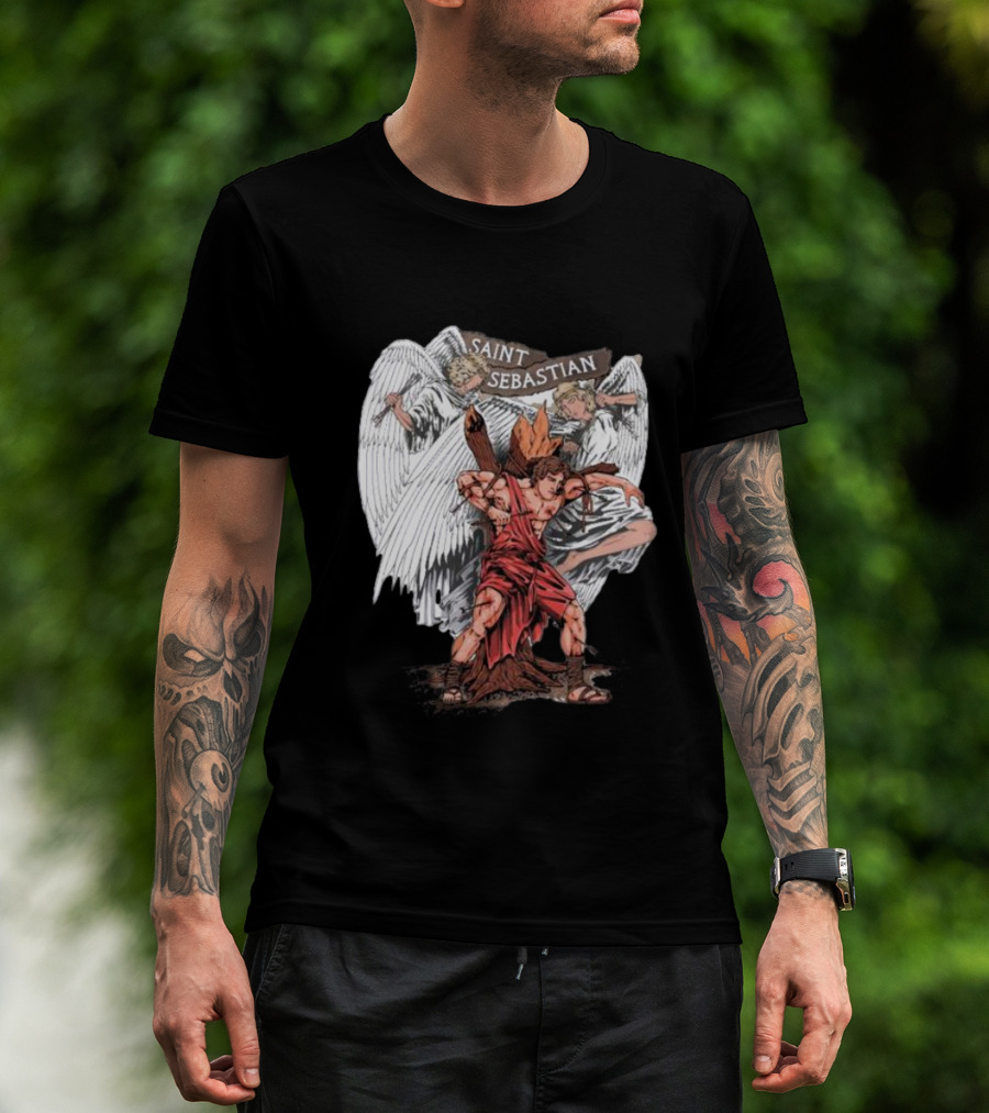 The Saint Sebastian Angelic Guardians T-shirt is designed for everyday wear and a consistent fit. Fabric is pre-shrunk ring-spun cotton with durable stitching. See the size chart below for exact measurements.