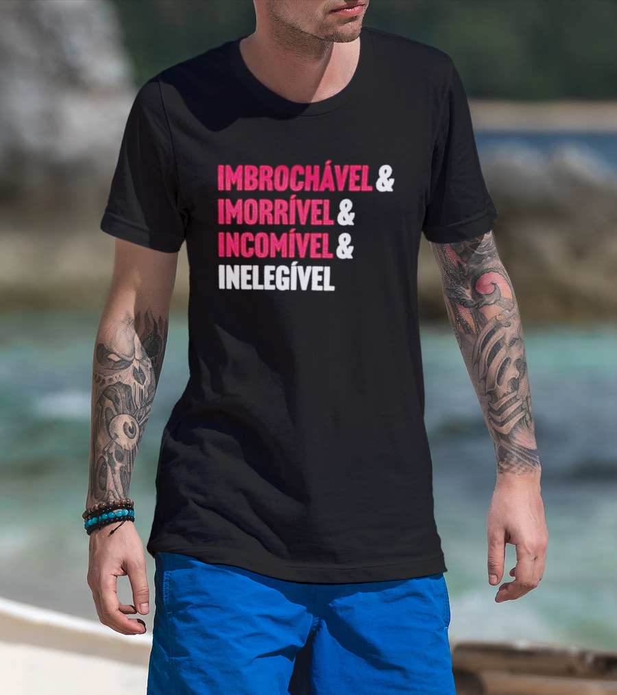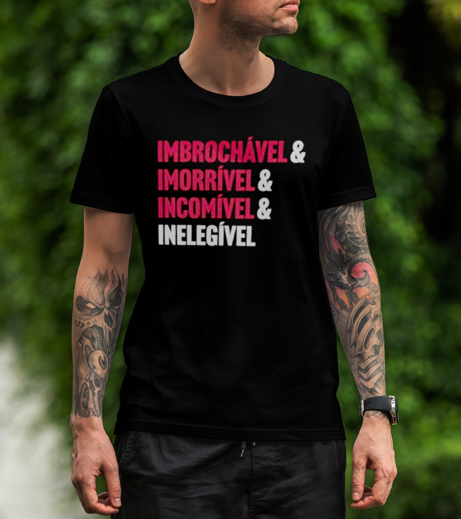 The Imbrochável Imorrível Incomível Inelegível T-shirt is designed for everyday wear and a consistent fit. Fabric is pre-shrunk ring-spun cotton with durable stitching. See the size chart below for exact measurements.