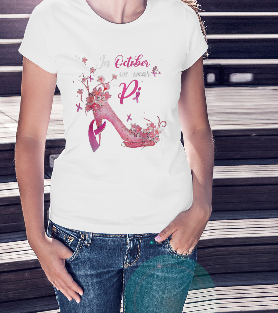 In October We Wear Pink Breast Cancer Awareness High Heel Butterflies Ribbons T-Shirt