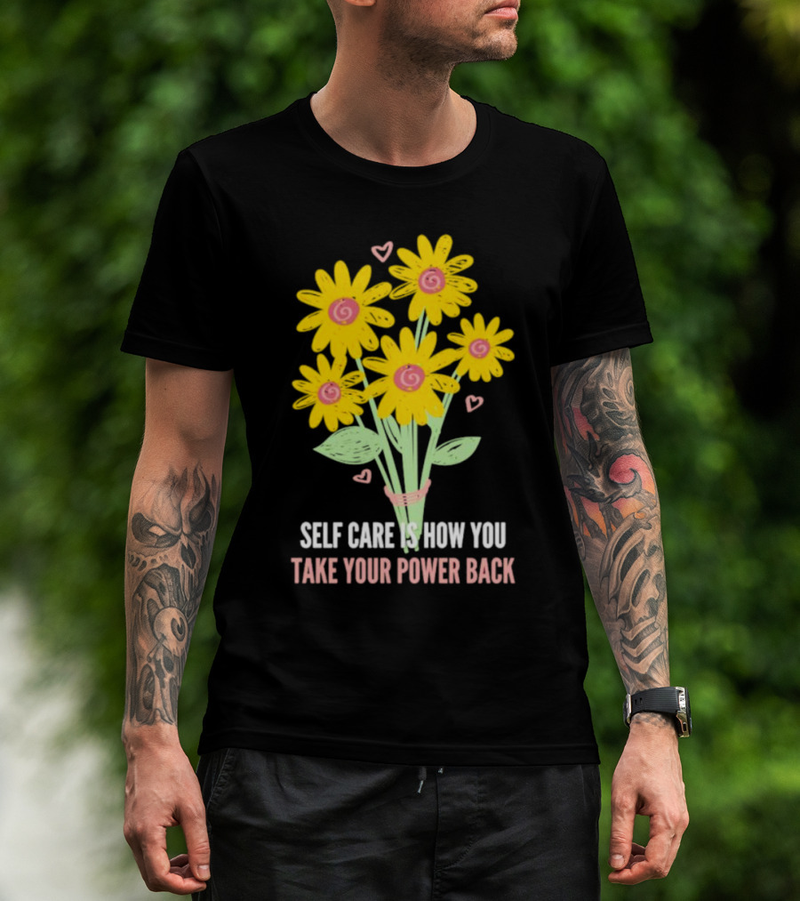 Self Care Is How You Take Your Power Back With Yellow Flowers And Pink Hearts T-Shirt