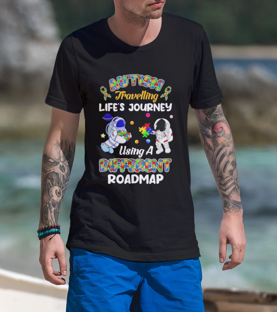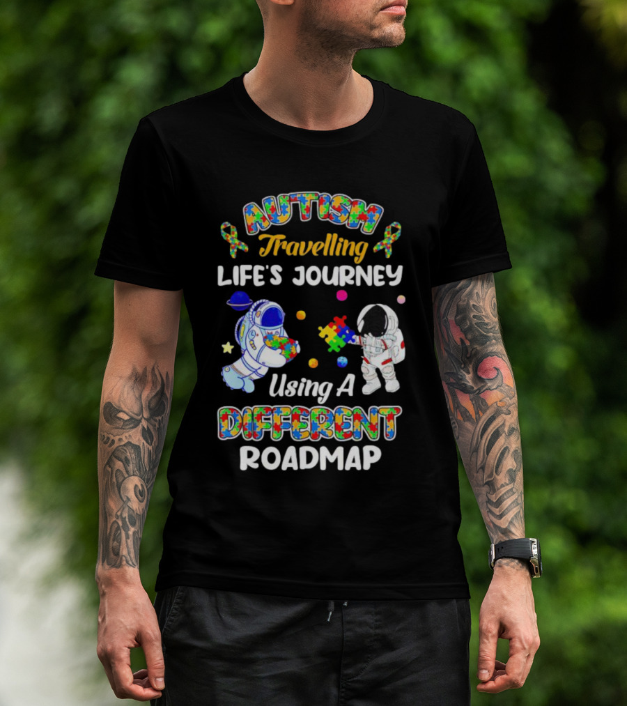 Autism Travelling Life's Journey Using A Different Roadmap With Astronauts And Puzzle Pieces T-Shirt