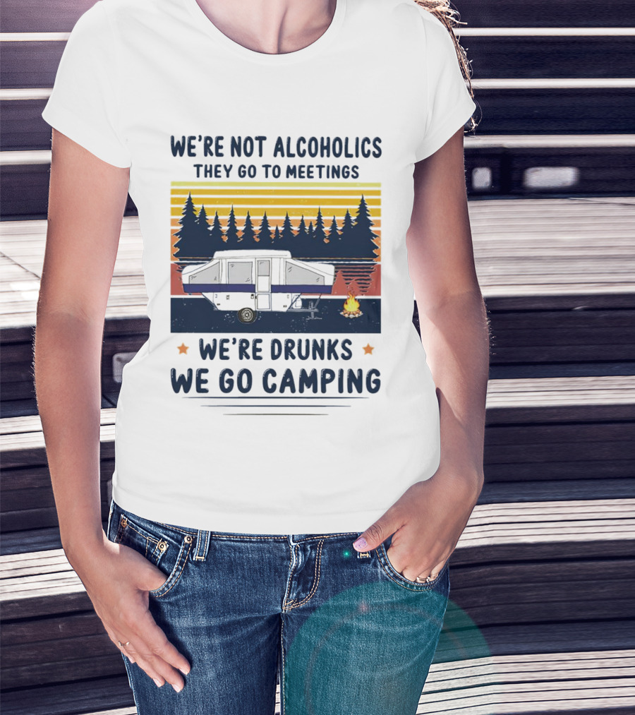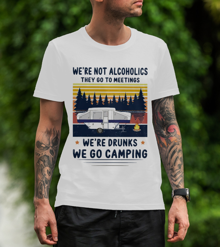 We're Not Alcoholics They Go To Meetings We're Drunks We Go Camping Forest Sunset Camper Fire Vintage T-Shirt