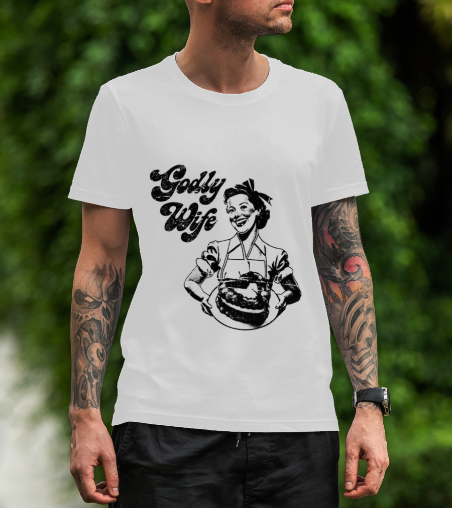 The Godly Wife Retro Baking Housewife T-shirt is designed for everyday wear and a consistent fit. Fabric is pre-shrunk ring-spun cotton with durable stitching. See the size chart below for exact measurements.