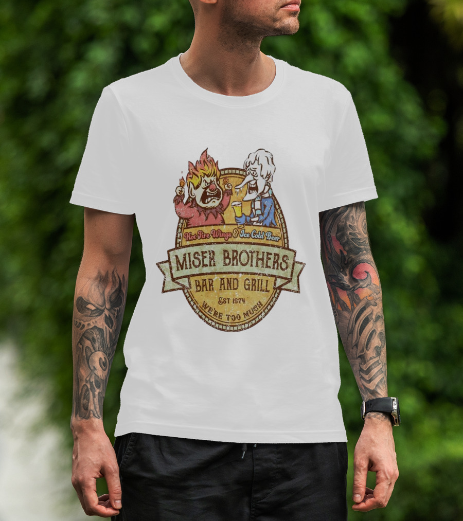 The Miser Brothers Bar and Grill Hot Fire Wings Ice Cold Beer Est 1974 We're Too Much T-shirt is designed for everyday wear and a consistent fit. Fabric is pre-shrunk ring-spun cotton with durable stitching. See the size chart below for exact measurements.