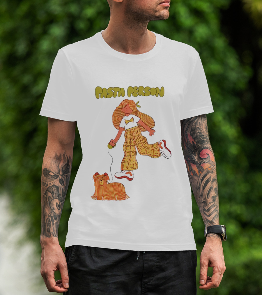 The Pasta Person Walking Dog in Checkered Pants and White Sneakers T-shirt is designed for everyday wear and a consistent fit. Fabric is pre-shrunk ring-spun cotton with durable stitching. See the size chart below for exact measurements.