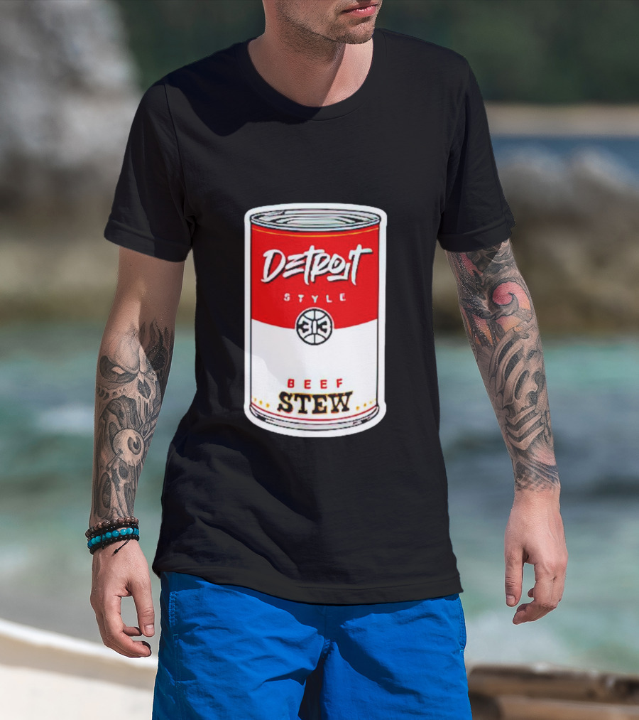 The Detroit Style 313 Beef Stew Can T-shirt is designed for everyday wear and a consistent fit. Fabric is pre-shrunk ring-spun cotton with durable stitching. See the size chart below for exact measurements.