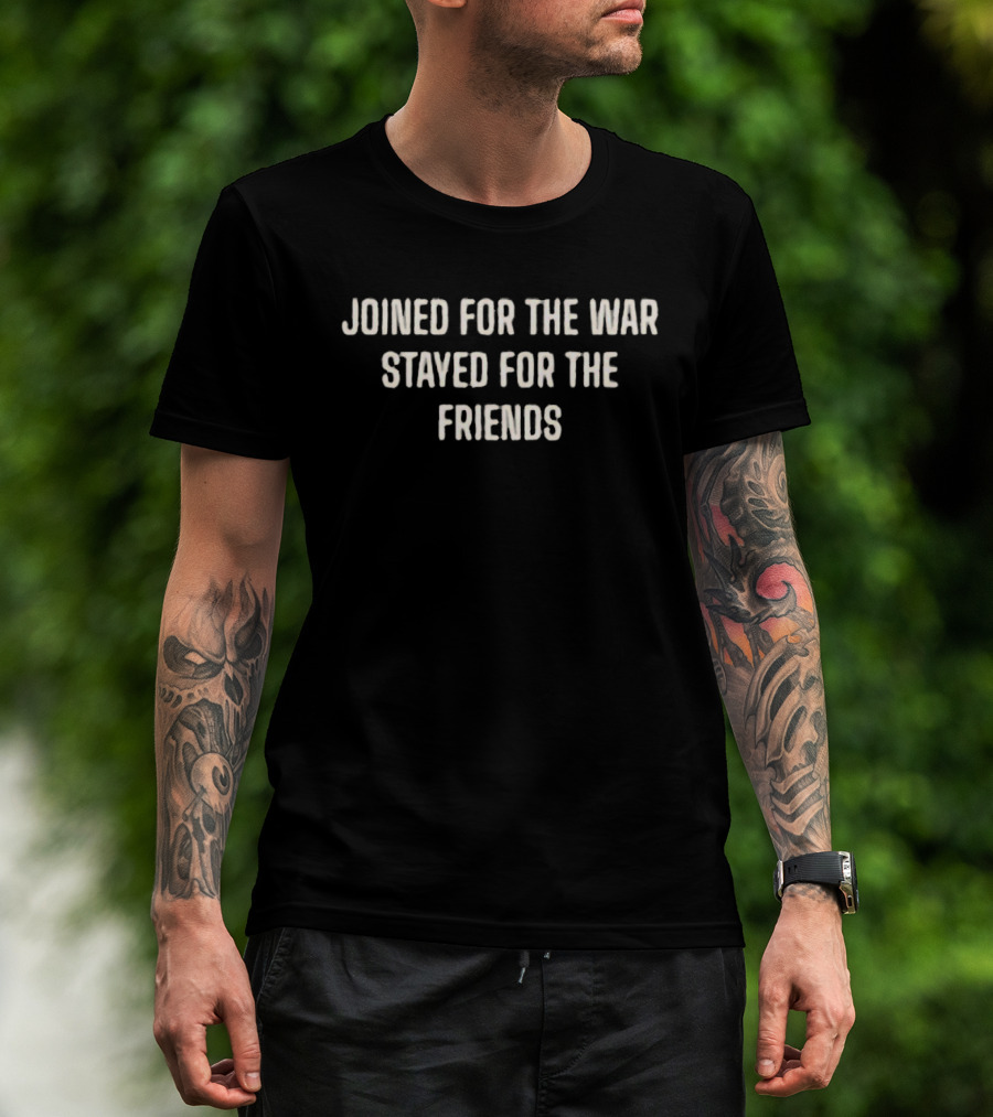 The Joined for the War Stayed for the Friends T-shirt is designed for everyday wear and a consistent fit. Fabric is pre-shrunk ring-spun cotton with durable stitching. See the size chart below for exact measurements.