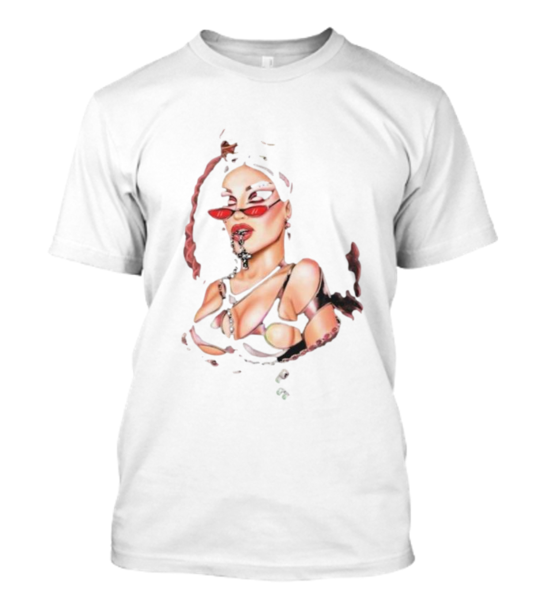The Kylie Sonique Love Goth Style in Edgy Outfit and Red Glasses T-shirt is designed for everyday wear and a consistent fit. Fabric is pre-shrunk ring-spun cotton with durable stitching. See the size chart below for exact measurements.