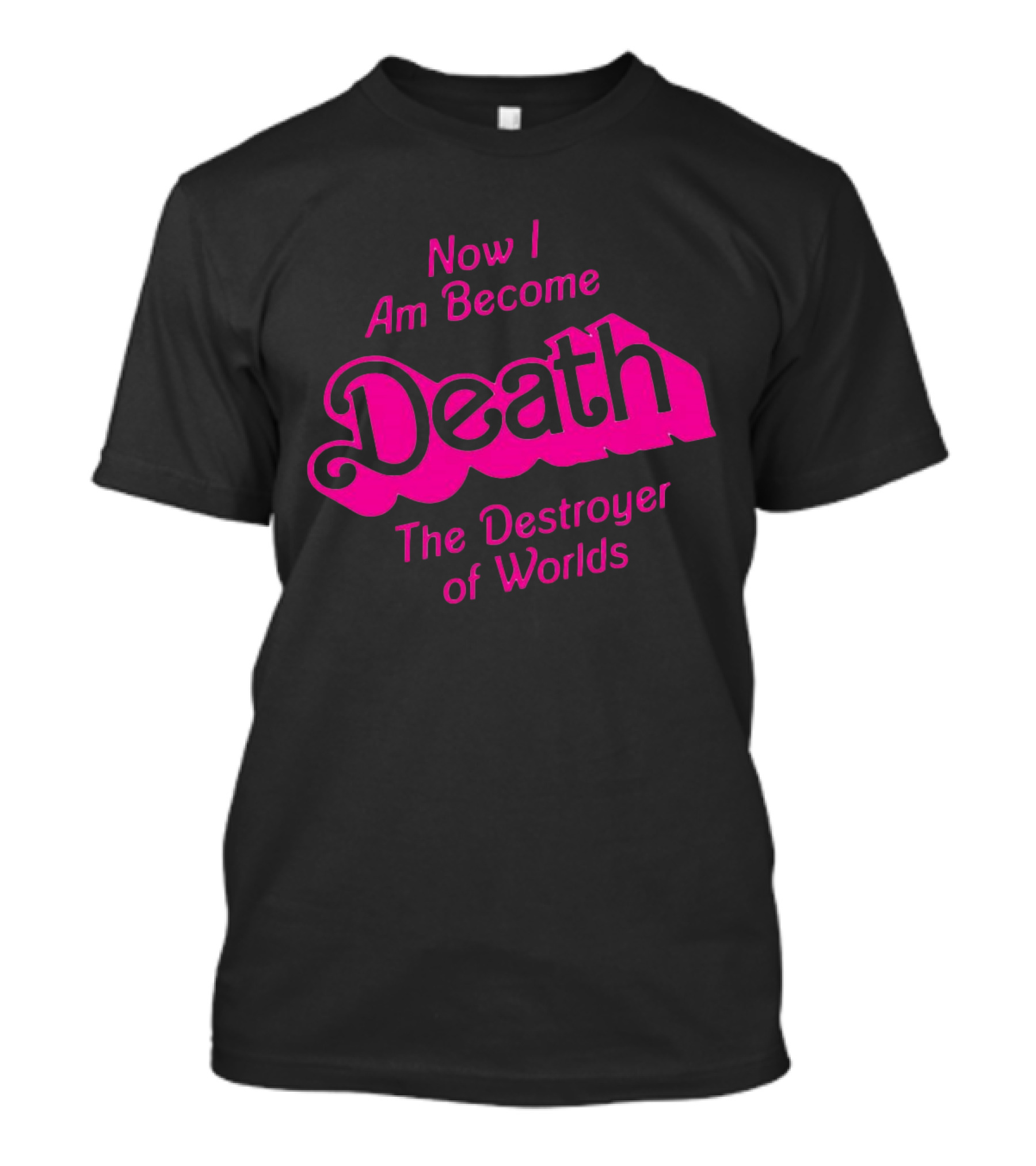 The Now I Am Become Death The Destroyer of Worlds Barbie Movie T-shirt is designed for everyday wear and a consistent fit. Fabric is pre-shrunk ring-spun cotton with durable stitching. See the size chart below for exact measurements.