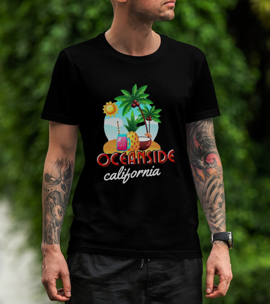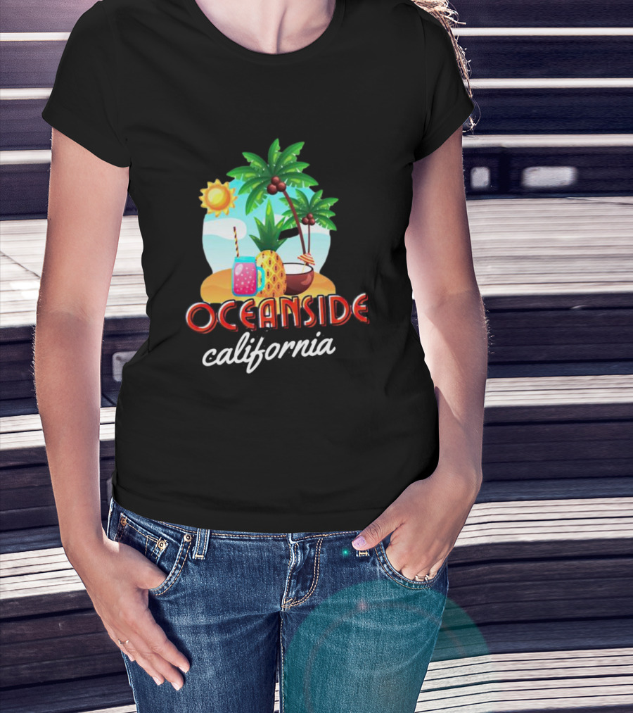Oceanside California Tropical Beach Scene With Palm Trees, Sun, Pineapple, Coconut Drink, And Refreshing Beverage T-Shirt