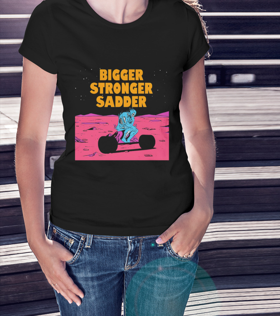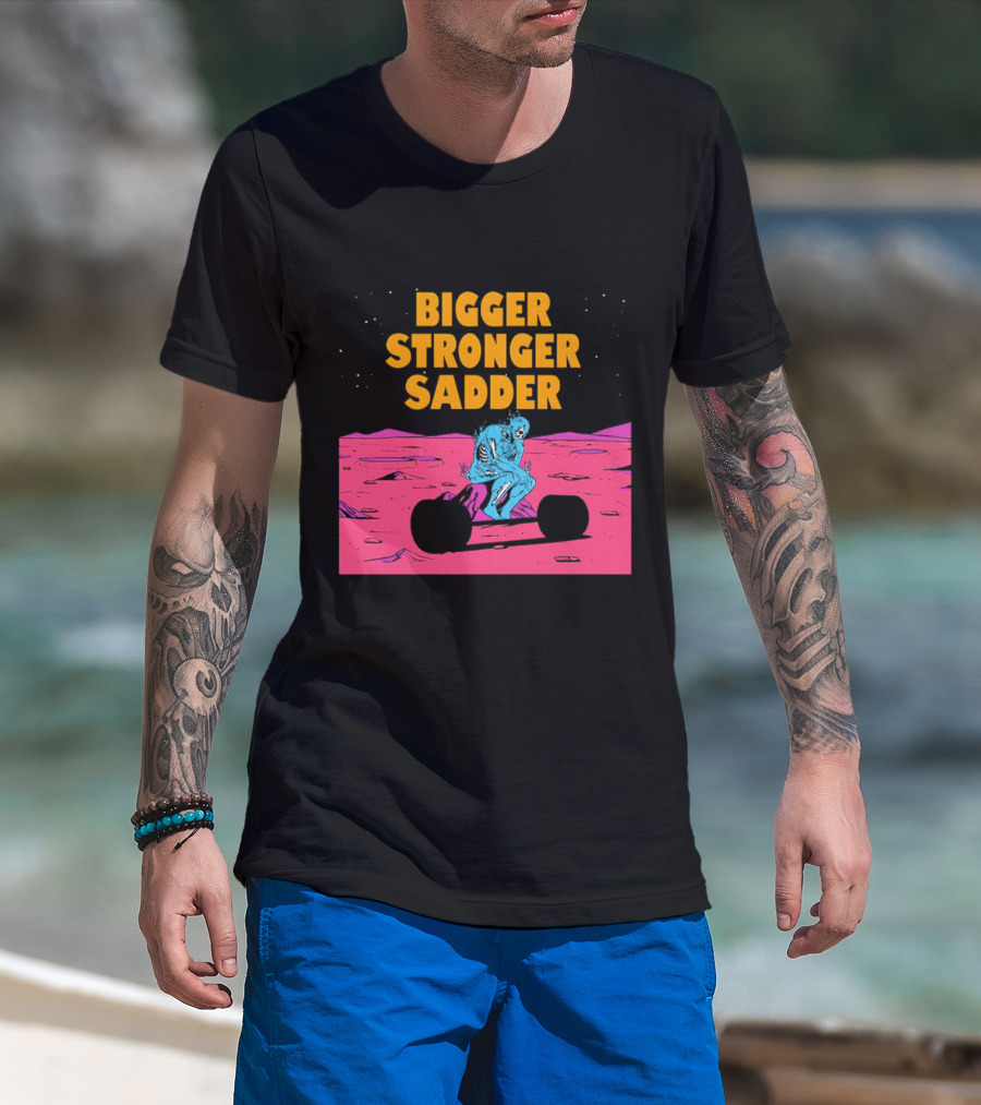 Bigger Stronger Sadder Skeleton Lifting Weights On Alien Planet T-Shirt