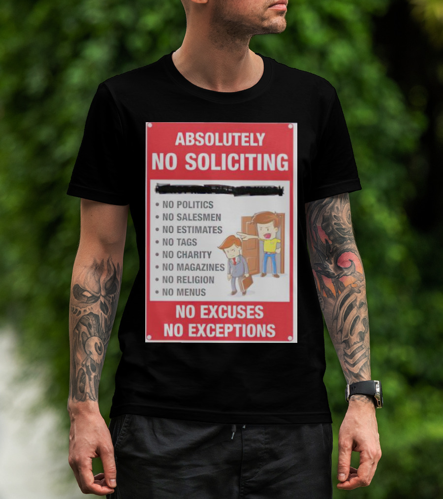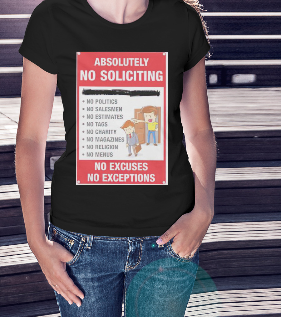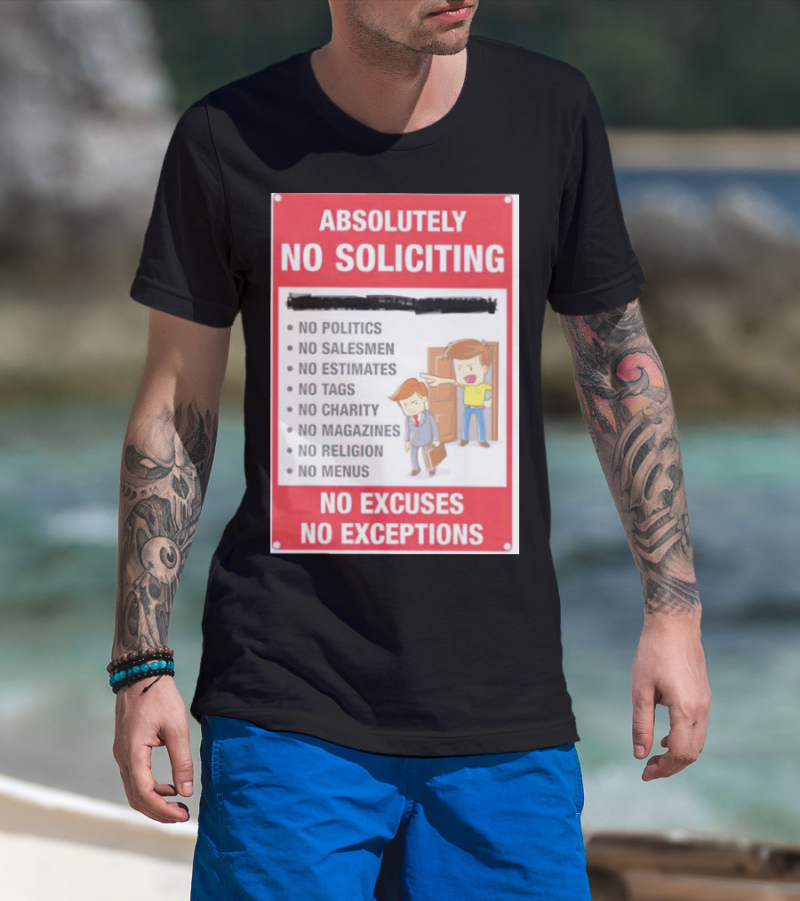 Absolutely No Soliciting No Politics No Salesmen No Estimates No Tags No Charity No Magazines No Religion No Menus No Excuses No Exceptions T-Shirt