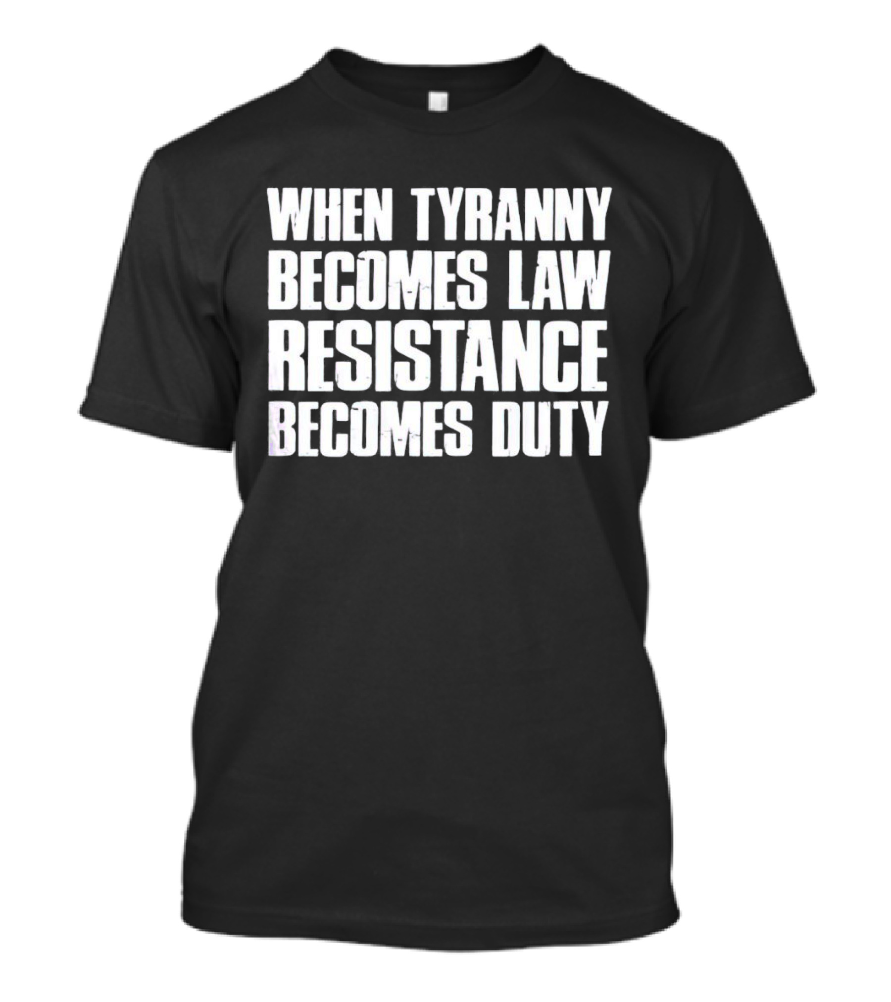 The When Tyranny Becomes Law Resistance Becomes Duty Bold Statement in White Block Text T-shirt is designed for everyday wear and a consistent fit. Fabric is pre-shrunk ring-spun cotton with durable stitching. See the size chart below for exact measurements.